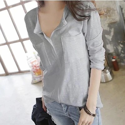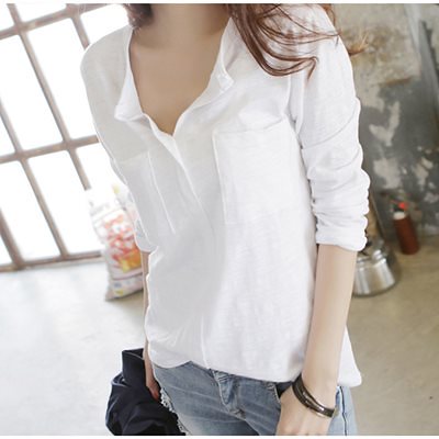 2023年ワイルドシンプルニューコットン長袖TシャツレディースVネックゆったり韓国の春と秋ベーシックシTシャツ