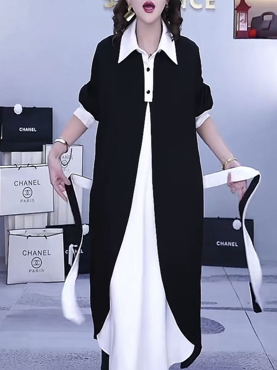 2025 年春・秋の新モデル ファッションでオシャレな疑似 2 枚組カラーブロックのブラウスワンピース 韓国風 リラックスフィットで痩せ見になりマッチしやすいロングドレス