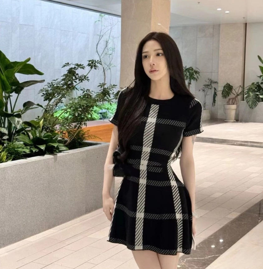 2025 年夏の新商品 フレンチヴィンテージ・ヘボンスタイルのニットワンピース 女性用 高級感溢れる上品な名媛スタイル ウエストタックスドデザインのドレス