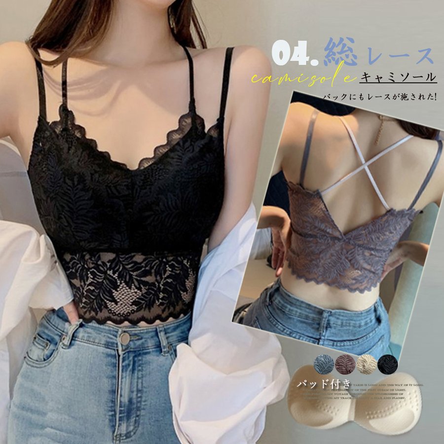 総レースキャミソール Vネック チラ見せ インナー パッド付き ショート丈 ノンワイヤー 韓国風 春