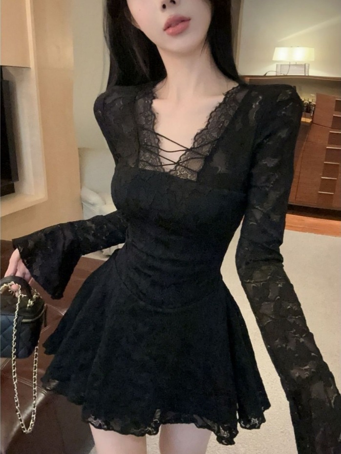 レースのピュアセクシースタイルの長袖ワンピース ウエストトレーニングで痩せ目に見える 新しいスタイルの短いスカート