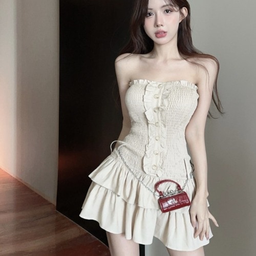 2025 春夏 ワンピースミニ丈 おしゃれかわいい ドレスタック Aライン韓国ファッション レディース白スリーブお出かけキュート甘めフレンチ