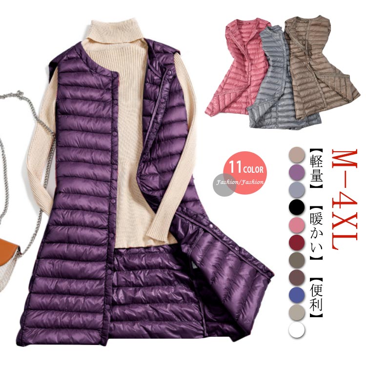 レディース ロングダウンベスト ロング丈 軽量 ダウンコート ノーカラー インナーダウン 超軽量ダウンベスト レディース ライトダウン 無地 アウター ゆったり 大きいサイズ