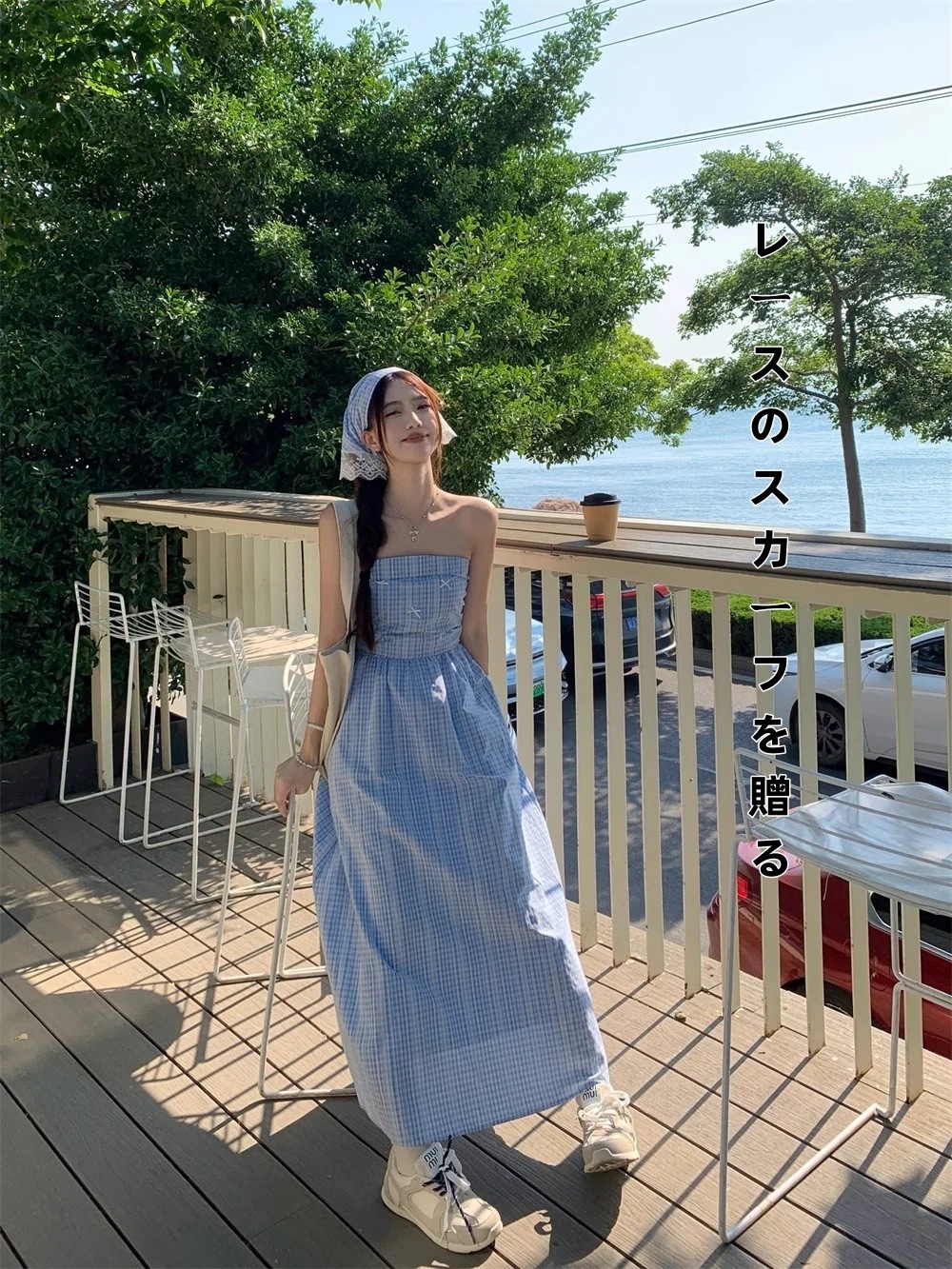 ワンピースレディース 2025新ロングスカートフレンチブルーチェック一字肩掛け胸拭きキャミソールワンピース