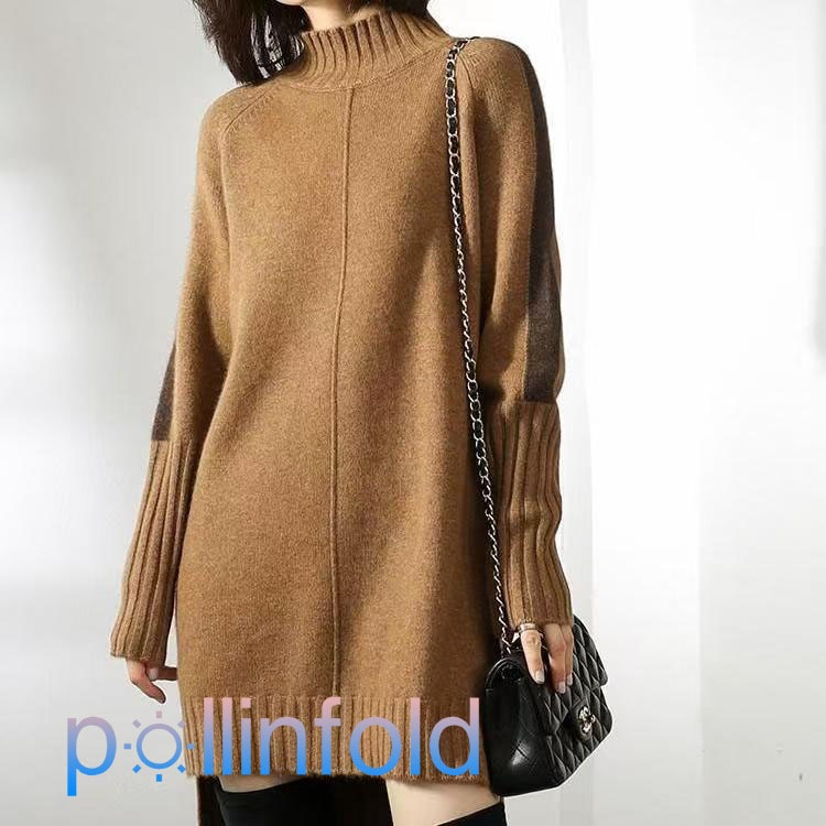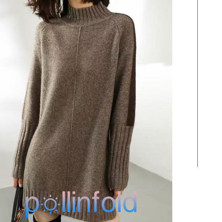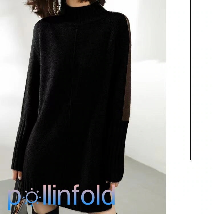 ニットワンピース レディース ロング 秋冬 ハイネック タートルネック ボトルネック 前後差 長袖 膝丈 膝上丈 無地 腕切り替え 配色 ゆったり フ