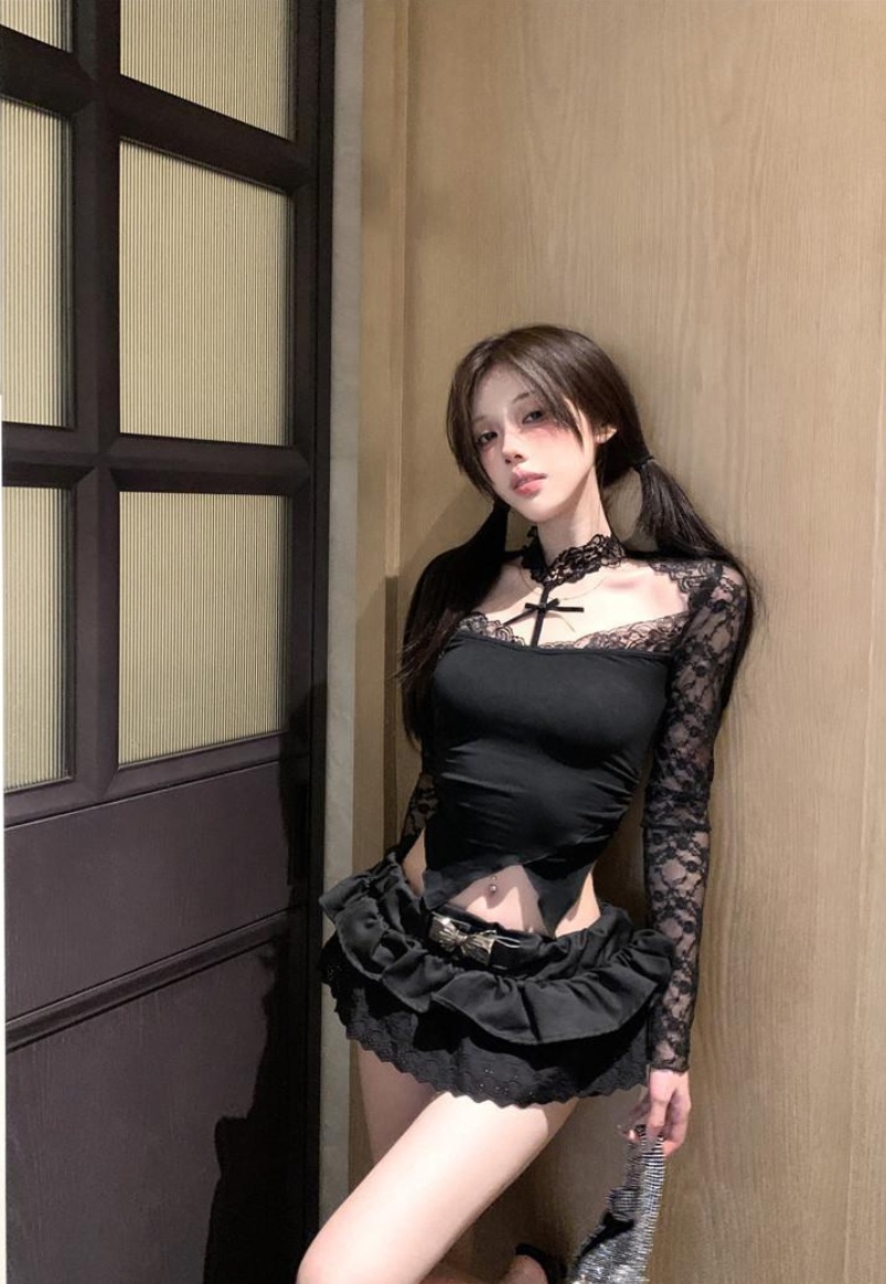 辣妹なセクシーレースのネックレスタイプで肩を出した長袖 T シャツ 女性向け秋の高級感ある黒色のボウタイが付いた不規則なアップタウン