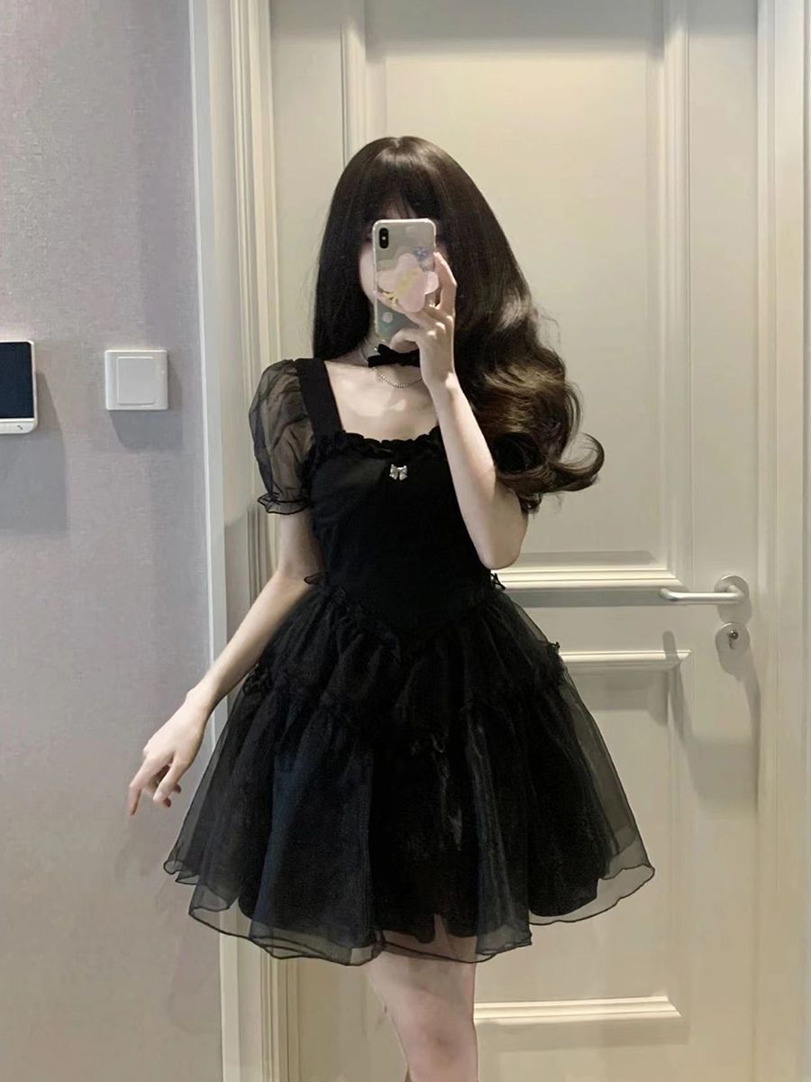 フレンチ風ヘプバーン風レトロ「初恋の黒いワンピース」 黒色ワンピース(サマー用) 気品あるバルーンスリーブプリンセス風フレアデザイン小柄体型向け