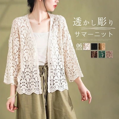 カーディガン サマーニット レディース ニット ボレロ 透かし彫り ニットカーデ 七分袖 前開き 薄手 羽織り アウター 上着 カーデ トップス ゆったり シンプル 着回し カジュアル レトロ 柔らか