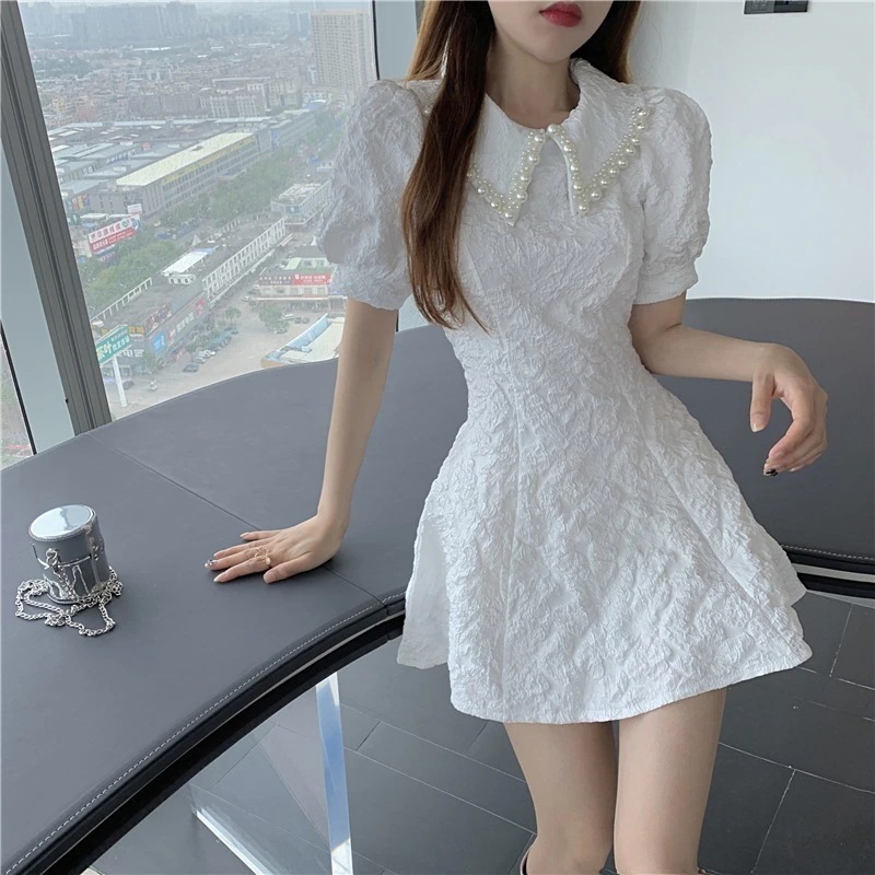くしゅカワ お嬢様ワンピ ミニワンピース 花柄 襟 パール パフスリーブ スタイルアップ フェミニン ガーリー お呼ばれコーデ
