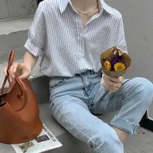 日系 ストライプブラウス レディース 韓国ファッション スリミング着痩せ 半袖ブラウス 快適 百掛け シフォンブラウス Tシャツ トップス
