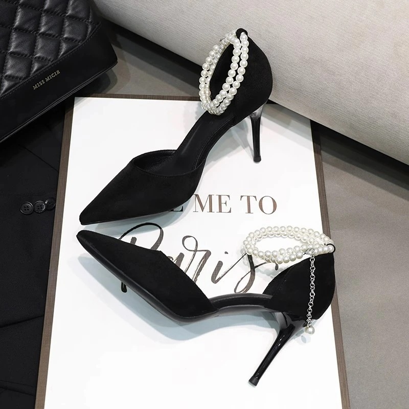 スタイルアップ!ヒールパンプス 2025新しい先の尖った細かいヒールハイヒールスエードパール一語バックルストラップサンダル