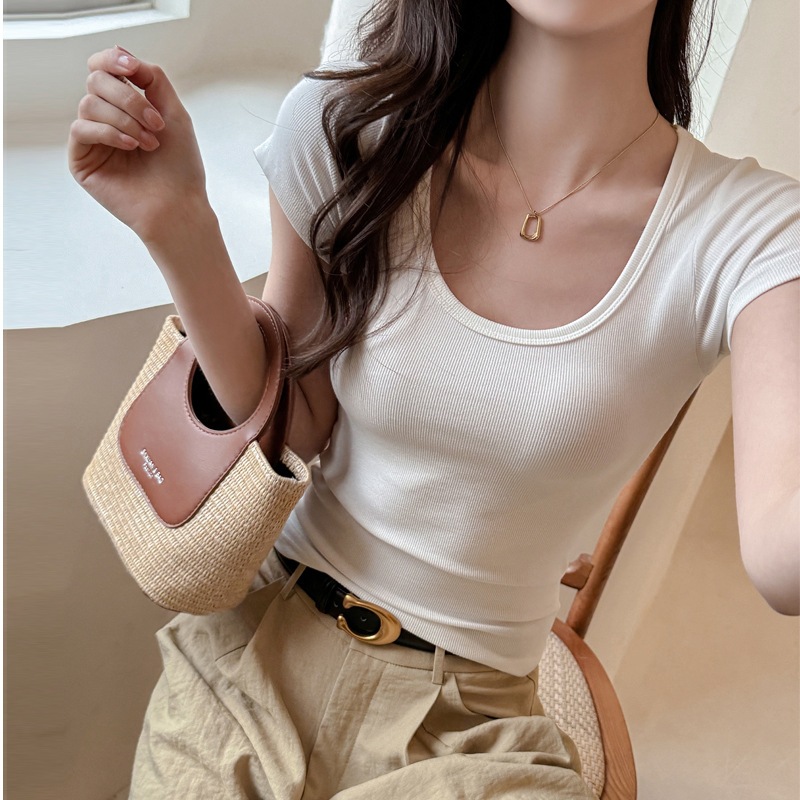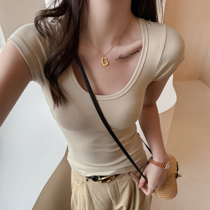 Tシャツ レディース トップス 無地 深め Uネック 半袖 綿 選べる サイズ 美シルエット タイト フィット セクシー カットソー シンプル オフィス カジュアル 骨格ストレート インナー 重ね着