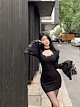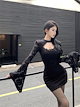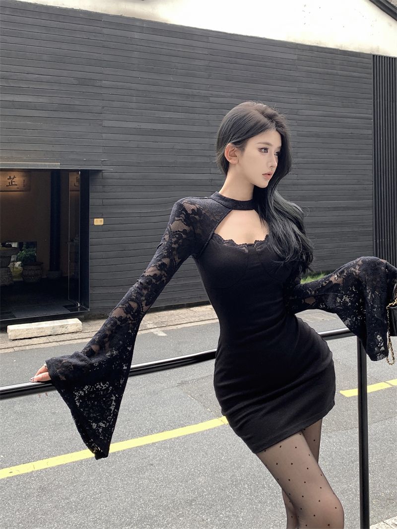 秋冬用の女性向けのラッパスリーブとネックレスタイ付きレースのワンピースピュアでセクシーなデザインで背中を露出しハイウエストでハリのあるヒップラインを強調します「おばさんドレス」とも呼ばれ名