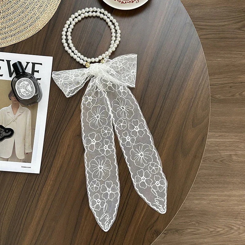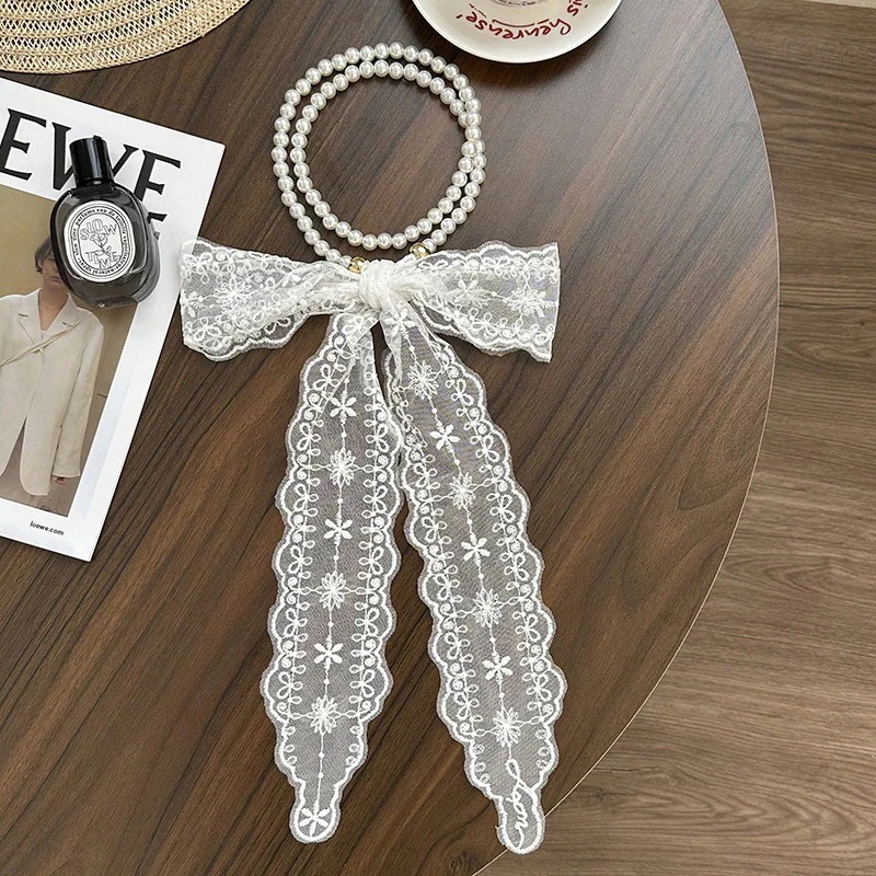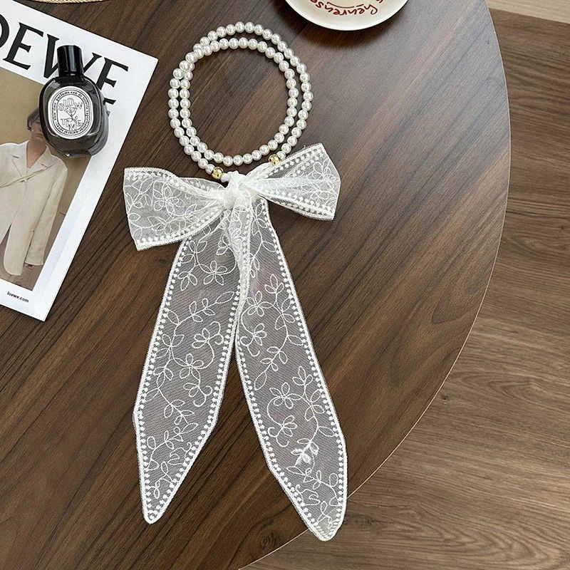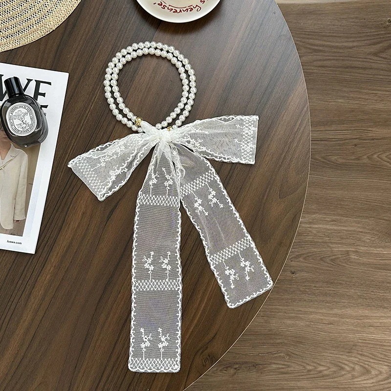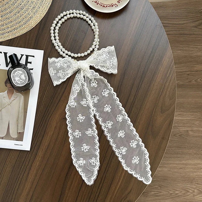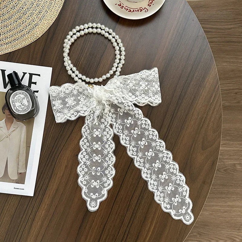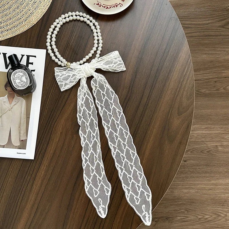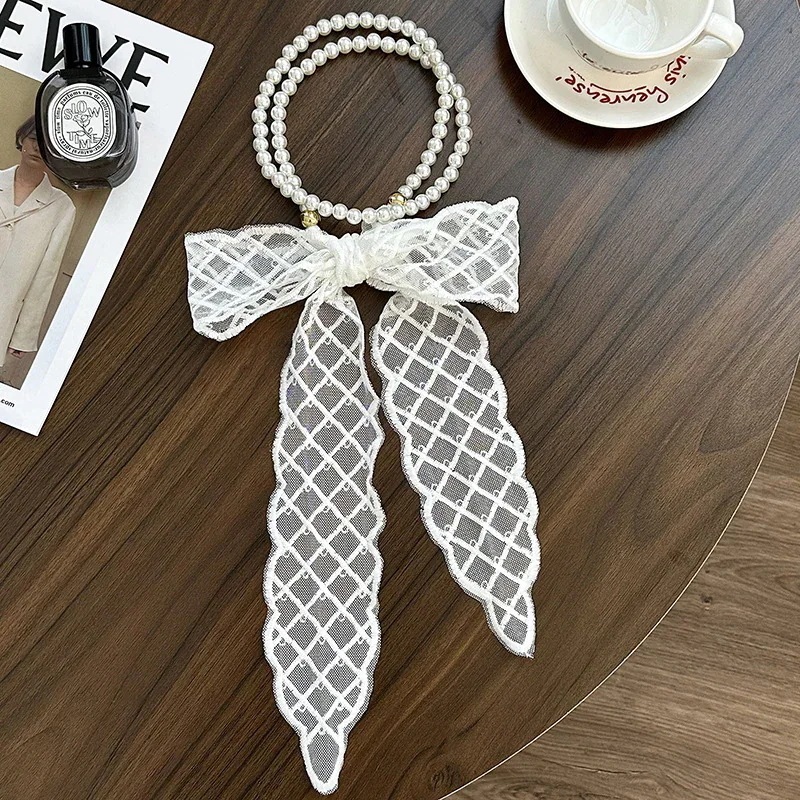 パールネックレス新しいフランス鎖骨チェーンレースシルクスカーフ プレミアム感ヘッドバンドヘアネクタイヘア多目的ウエストチェーンひらひらリボンスカーフ
