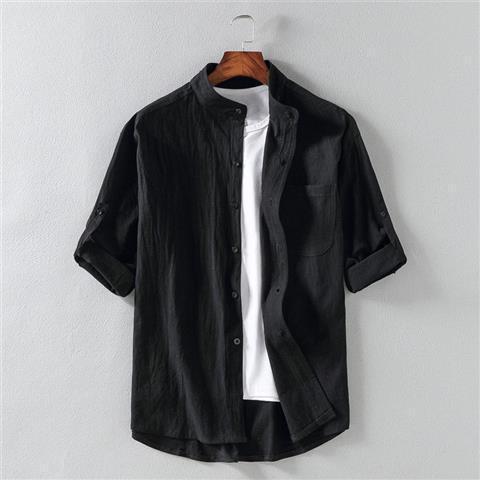 シャツ バンドカラー メンズ 綿麻 半袖シャツ ノーアイロン加工 胸ポケット 新作登場 七分袖 7分袖 襟なしシャツ バンドカラーシャツ 白シャツ
