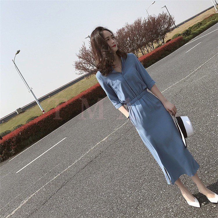 マキシワンピース シフォンワンピース 人気新品 マキシ丈 五分丈 夏 通勤 レディース V襟 ブルーオシャレ