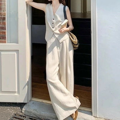 ワイドパンツ 無地 数量限定 ノースリーブ 夏 ブラウス 上下セット ゆったりめ レディース パンツセットアップ カジュアル ベスト+ロングパンツ