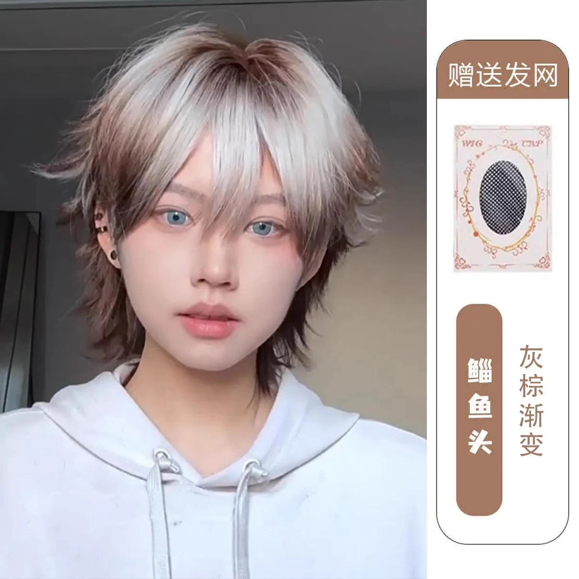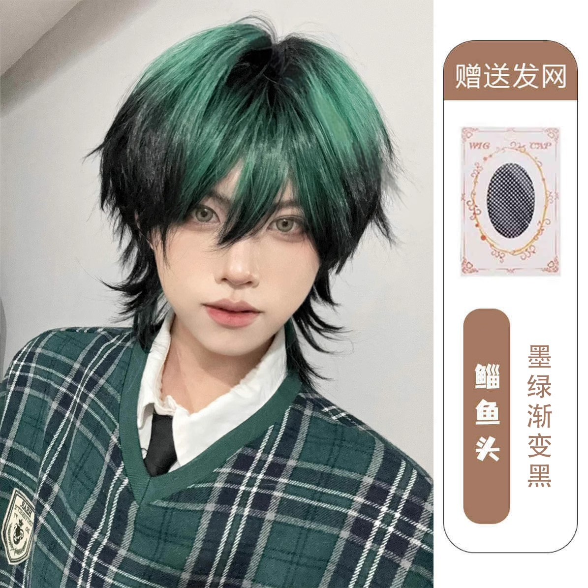 【厳選されたトレンドのウィッグ】ブラックグリーン グラデーション ウルフテール ショートヘア フルヘッドカバー 男性 コス パーソナル ハンサム ポップトップ 染めたマレット ナチュラル ヘアカバー