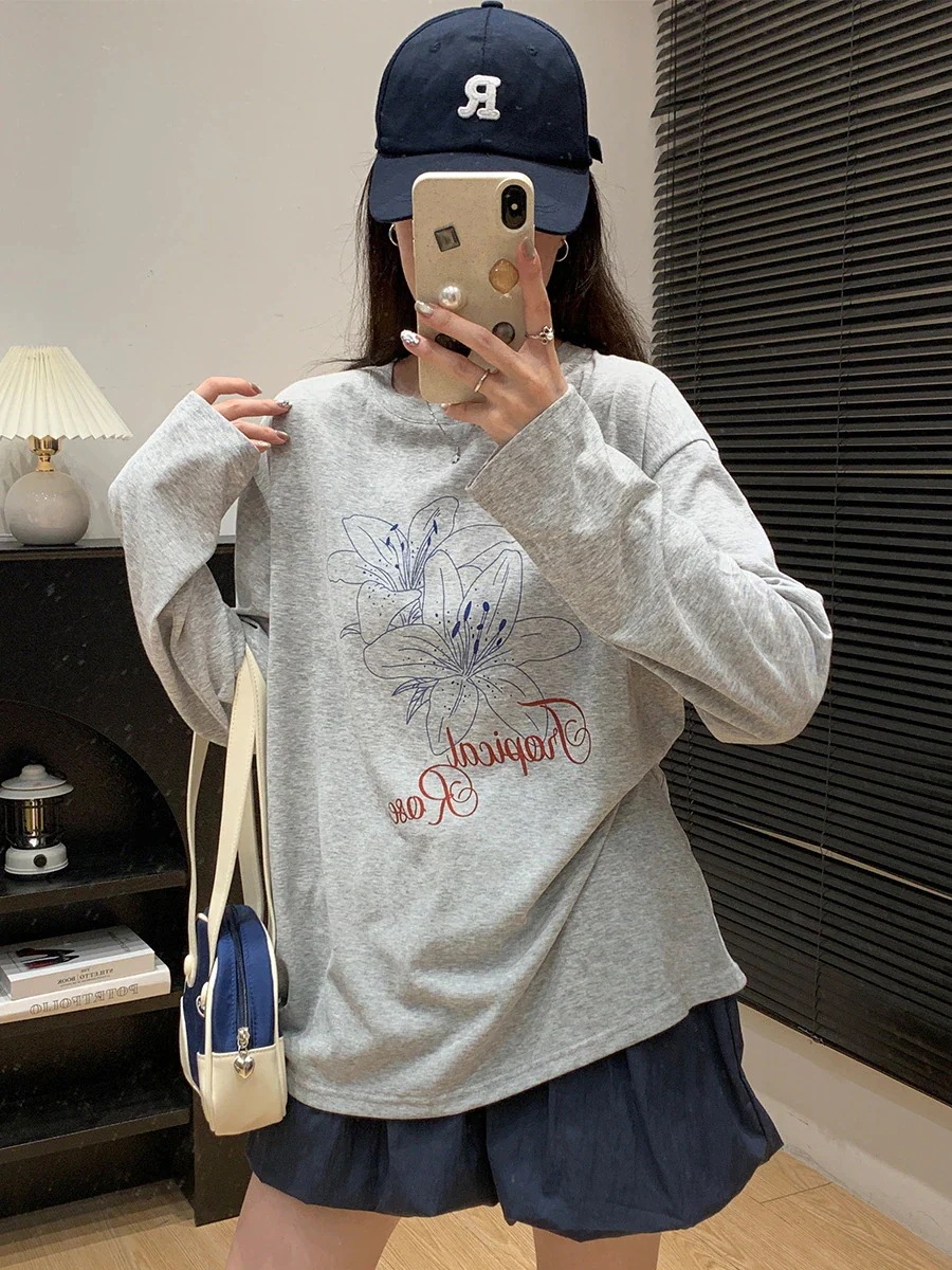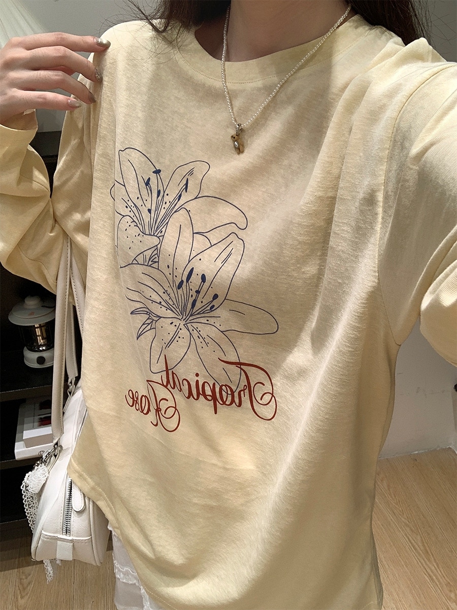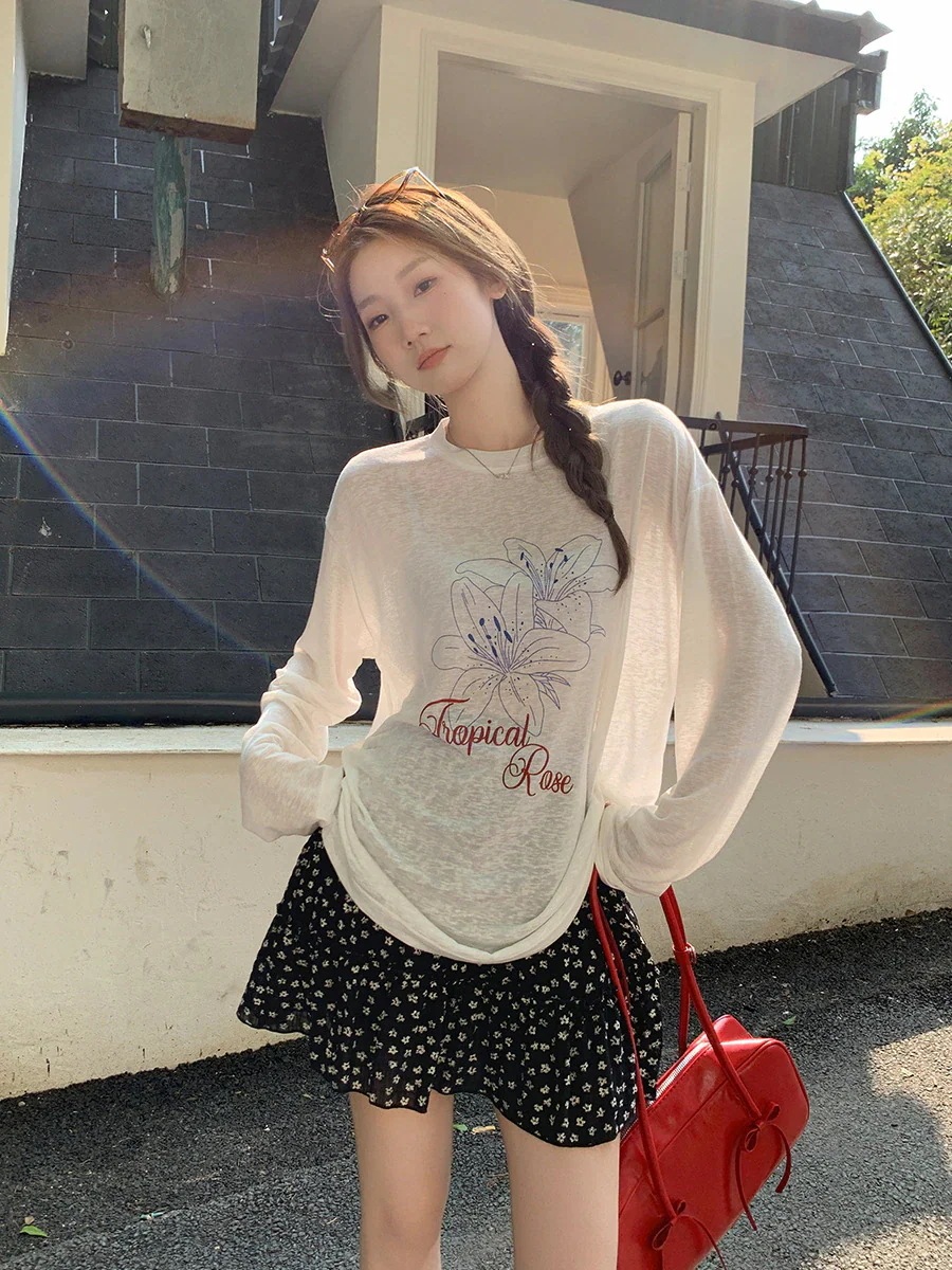 丸首プリントデザイン感日焼け止めブラウス長袖女 2025年夏新作ゆったりけだるい風薄手トップスTシャツ