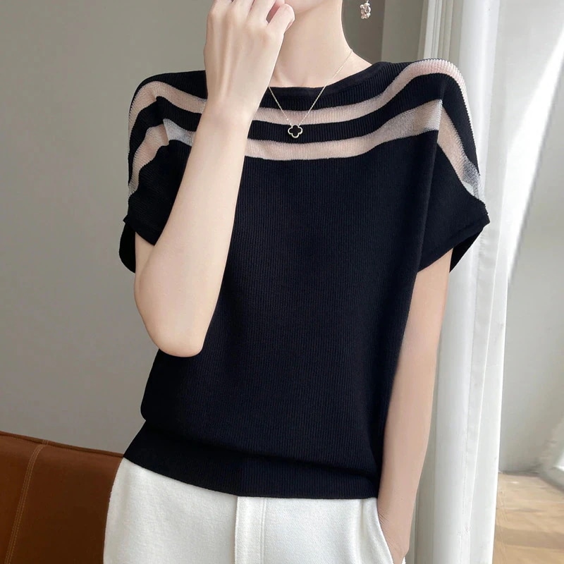 2025夏新作オーガンザキルティングアイスシルク丸首ニット半袖Tシャツ女 薄手のメッシュトップス夏Tシャツ