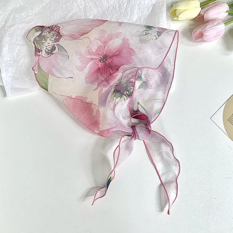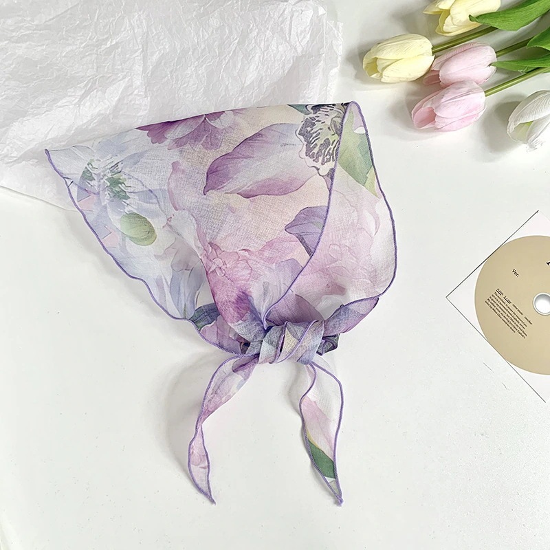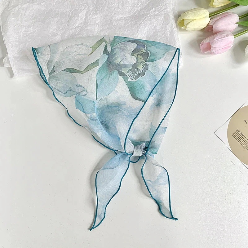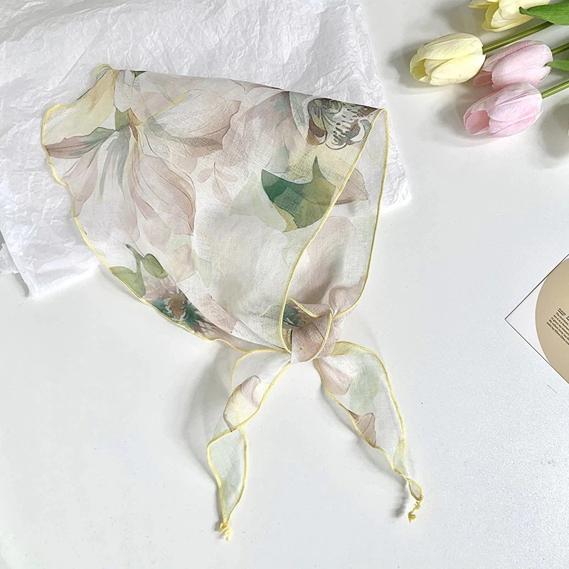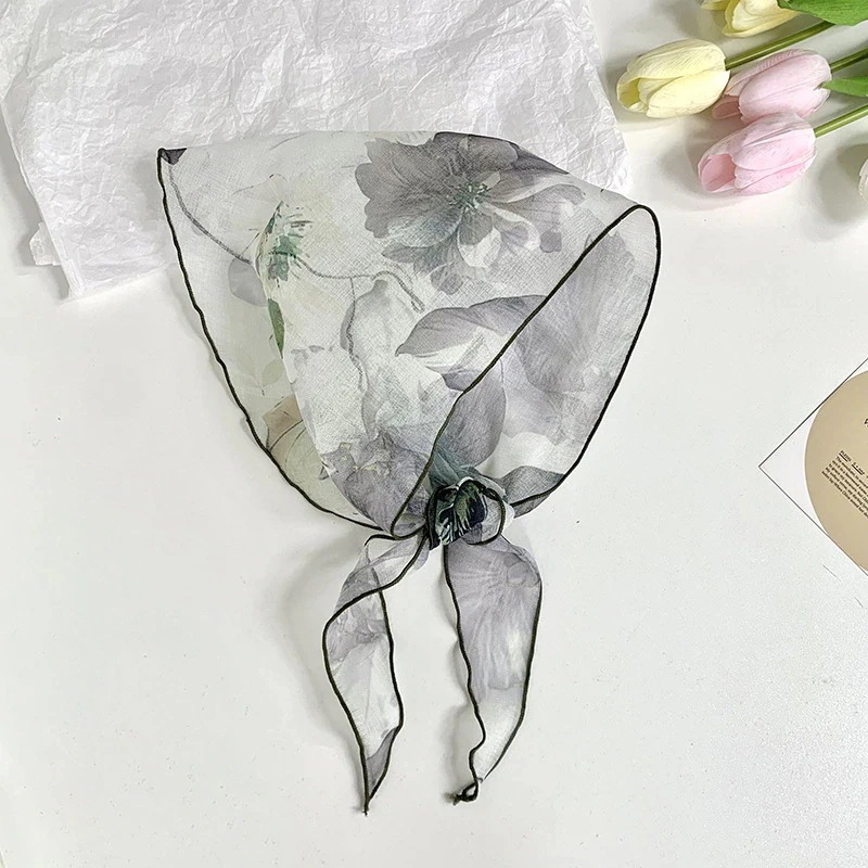 三角巾 ネックウォーマー 女性用シルクスカーフ 高級薄手シフォン 墨染め風 ヘッドスカーフ ヘアバンド ヘアタイ フローティングリボン