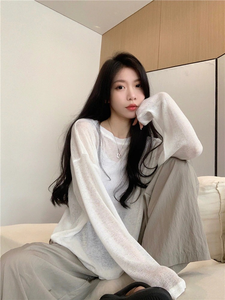 ホワイトの薄手デザインリラックススタイルのラウンドネック長袖Tシャツ女性用夏用ゆったりとしたシルエットでスリムに見せるカジュアルで合わせやすい日焼け防止カバーアップトップス