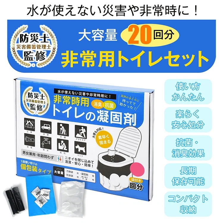 非常用トイレセット 20回分 強力な凝固剤 使い捨て手袋 汚物袋 防臭袋 大容量 抗菌 消臭効果 長期保存可能 便器がない時 緊急時 非常用 地震 台風 豪雨 bs007