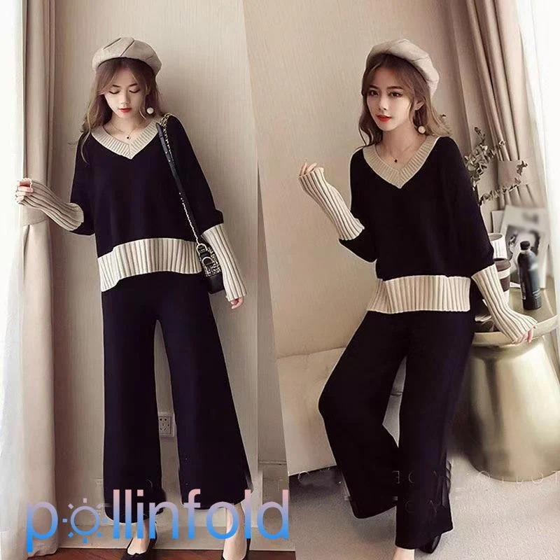 秋冬ファッションステッチニットセット,新型秋冬洋風カジュアルワイドパンツ2点セット
