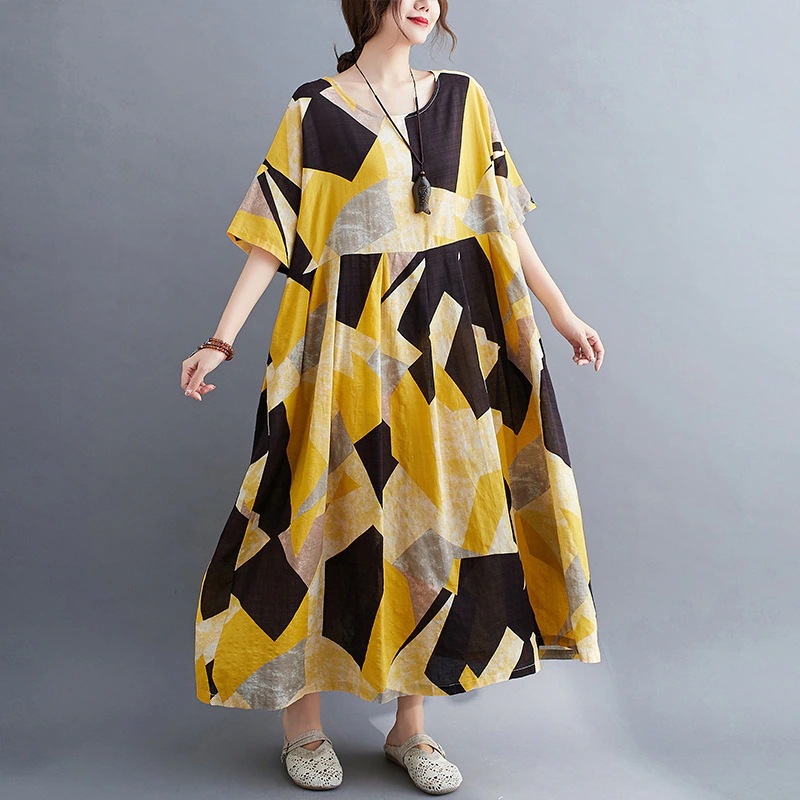 大サイズ女性用夏物ゆったりデザインコットンリネンロングスカート ぽっちゃり体型の女性向けミディアム丈お腹を隠すプリント柄ワンピース