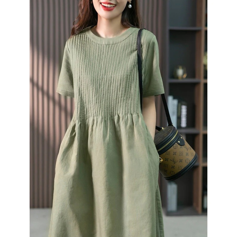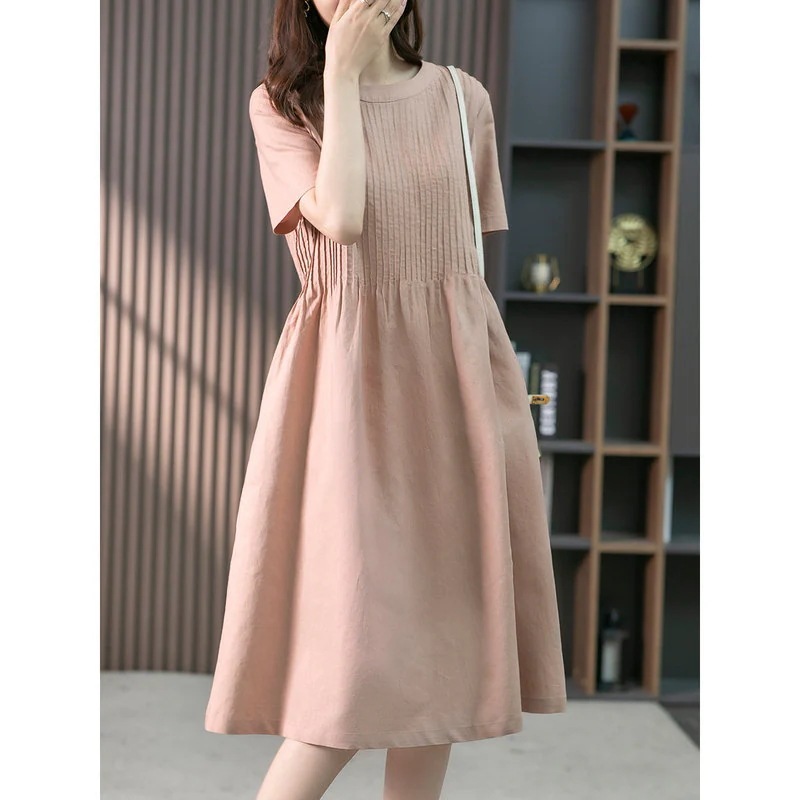 リネン素材の女性用ミディアム丈ドレス 2025年夏の新作韓国風デザインゆったりとしたシルエットのミディアム丈ドレス