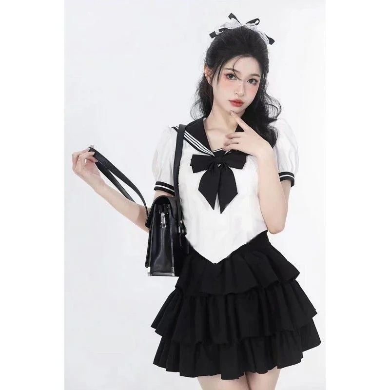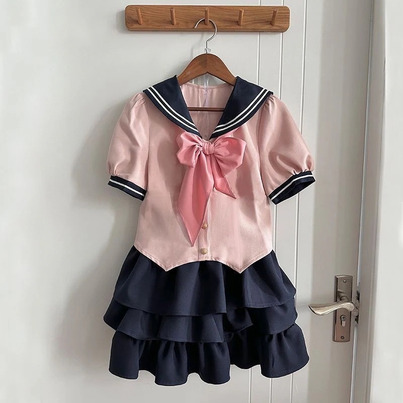 JK制服海軍襟パッチワークカラーバタフライリボン半袖+フリルケーキミニスカート2点セット
