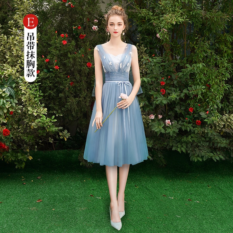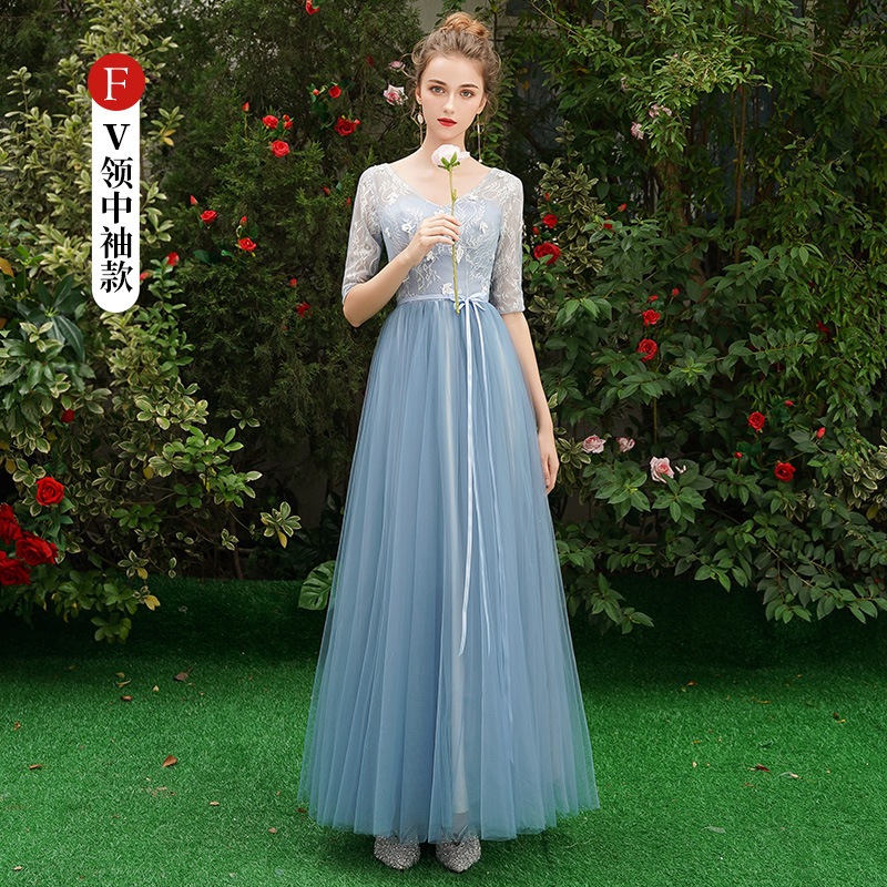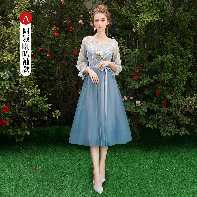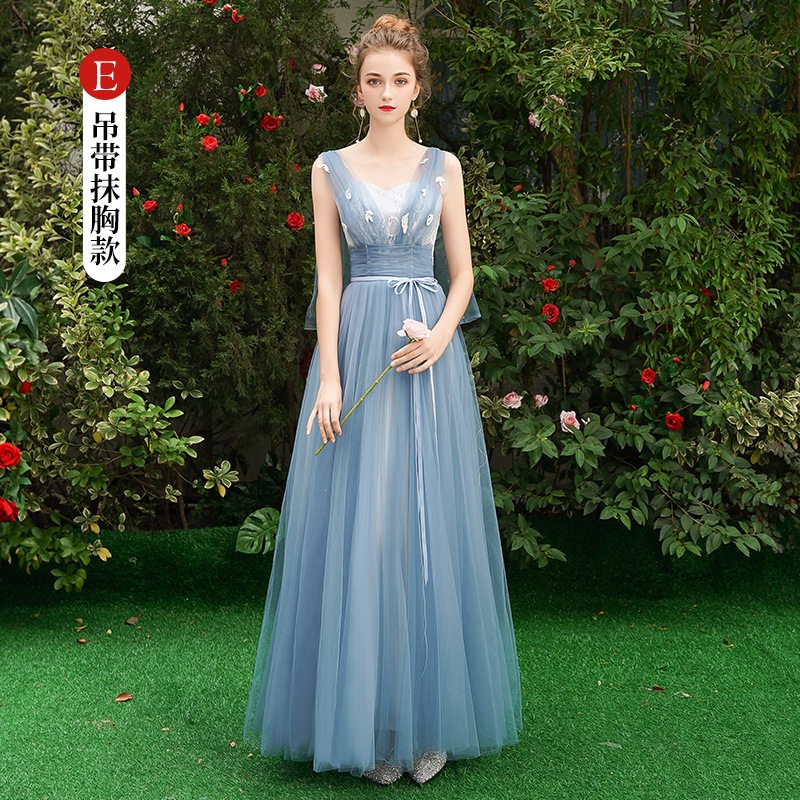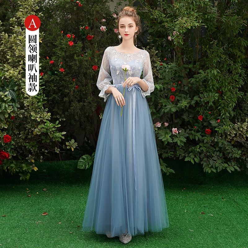 ウェディングドレス ブライズメイド カラードレス ブルーグレー 綺麗 韓国風 ミディ丈 ロング丈 フォーマルドレス 二次会 Aライン 高校生 卒業式 結婚式 ワンピース オフショルダー 記念日