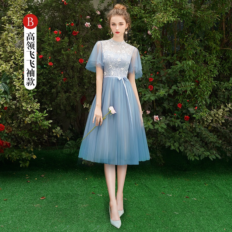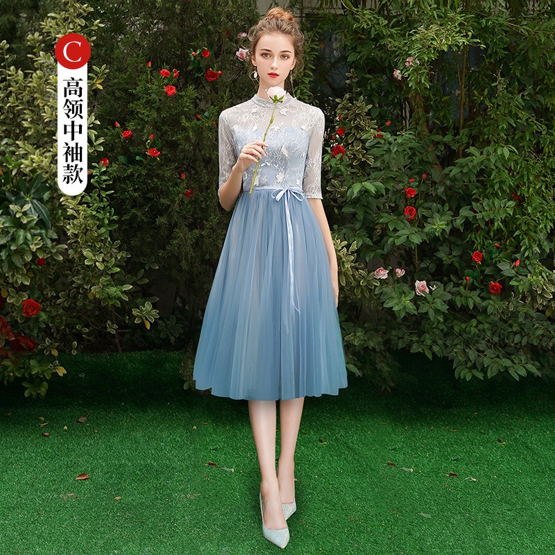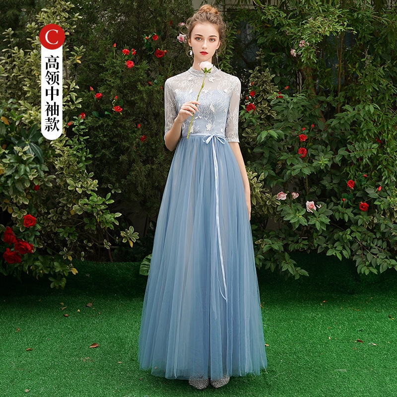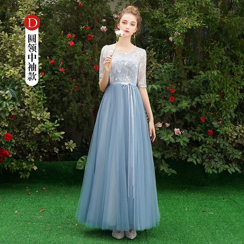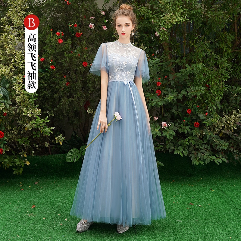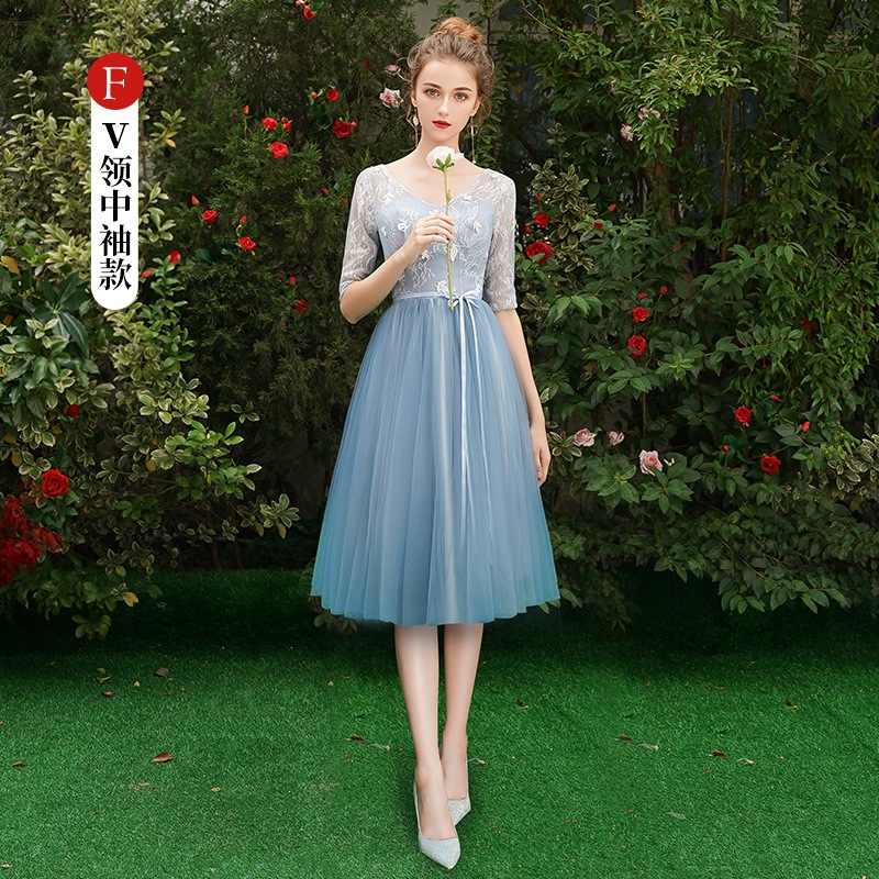 ウェディングドレス ブライズメイド カラードレス ブルーグレー 綺麗 韓国風 ミディ丈 ロング丈 フォーマルドレス 二次会 Aライン 高校生 卒業式 結婚式 ワンピース オフショルダー 記念日
