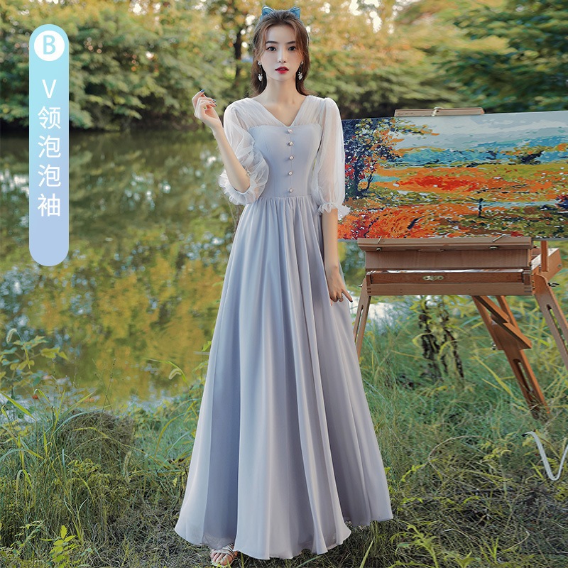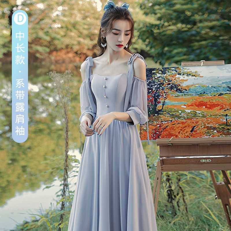ウェディングドレス ブライズメイド カラードレス グレー シンプル 韓国風 無地 ミディ丈 ロング丈 フォーマルドレス 二次会 Aライン 高校生 卒業式 結婚式 ワンピース オフショルダー 記念日