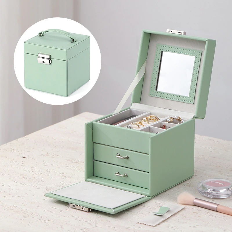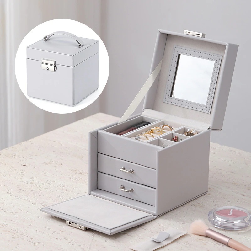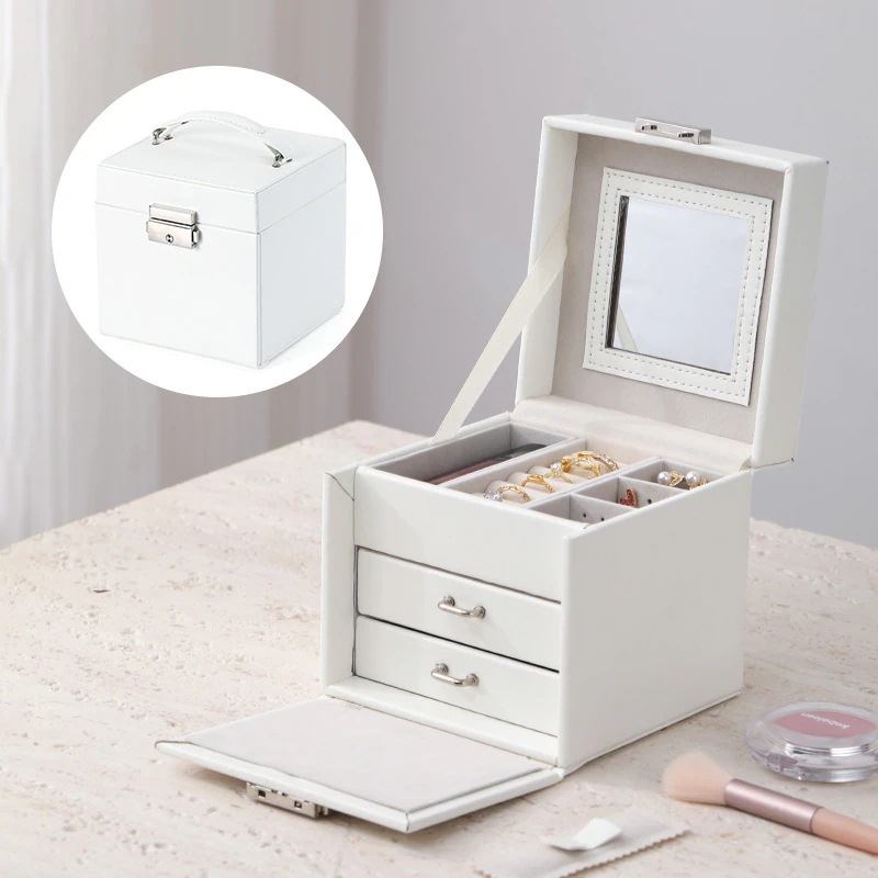 新デザインの本革製多層式フリップカバーミラー付きジュエリーボックス キー付きハンドバッグ型多機能リング&ネイルケアボックス 結婚式の引き出物用ジュエリーボックス