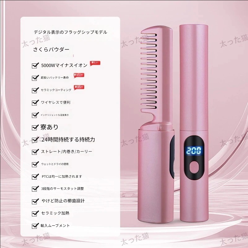 品質いいな ヒートブラシ コードレス ヘアアイロン ブラシアイロン USB充電式 温度3段階調節 デジタル表示 火傷防止 静電気防止 マイナスイオン ポータブル ミニ コンパクト 持ち