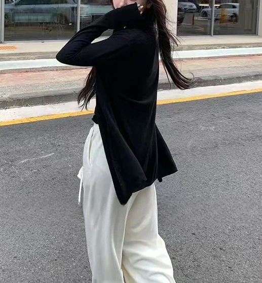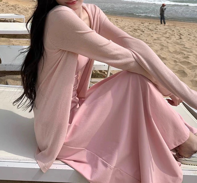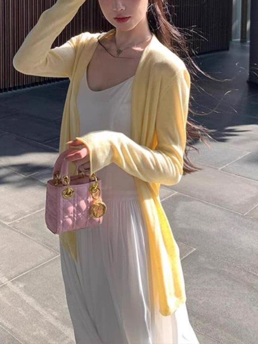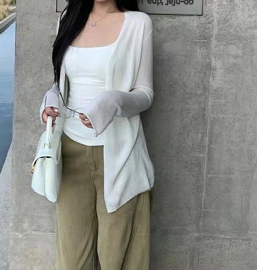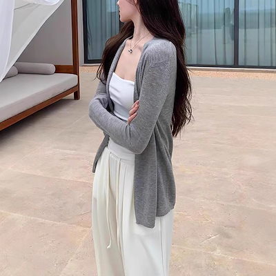 長袖の薄手デザインやや透け感のある中丈から長丈のトップス日焼け防止用のオーバーコートとして着用できる女性用の春夏のニットカーディガン
