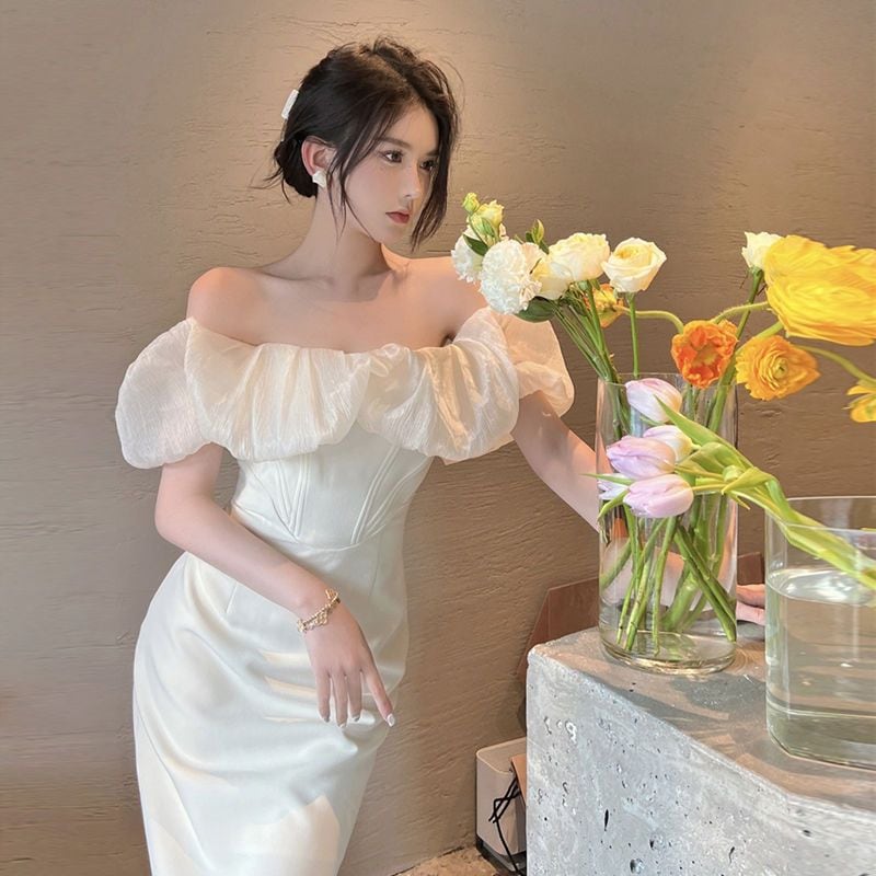レディース ボートネック 胸を塗り フランス スカート ミドル丈 受け取って腰 セクシー ドレス