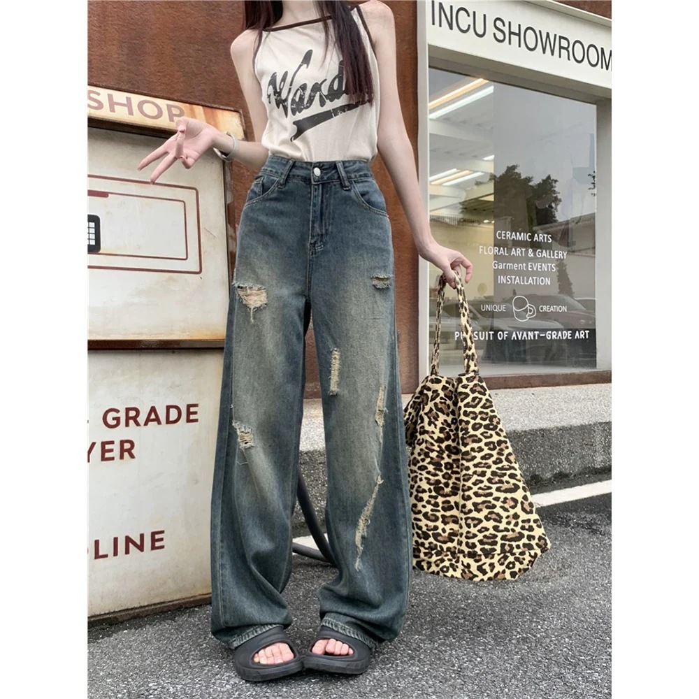 2025春夏 デニムパンツ ロング丈ボトムスハイウエストジーンズ K-POPストリートファッション系韓国風ファッション練習ジーンズ シルエット加工ゆったりレッグレディースカジュアルジーパン衣装