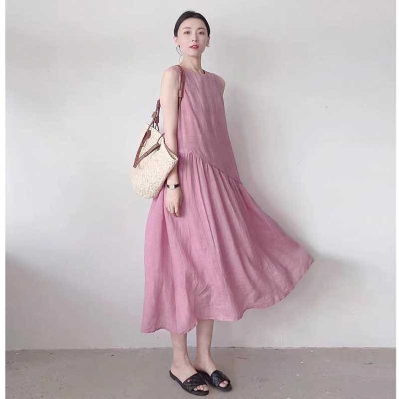 綿麻素材のワンピース(女性用) 2025年夏の新作 文学的な雰囲気の大サイズ ゆったりとした通気性のあるノースリーブの単色リネンドレス