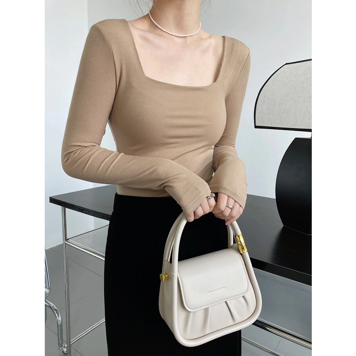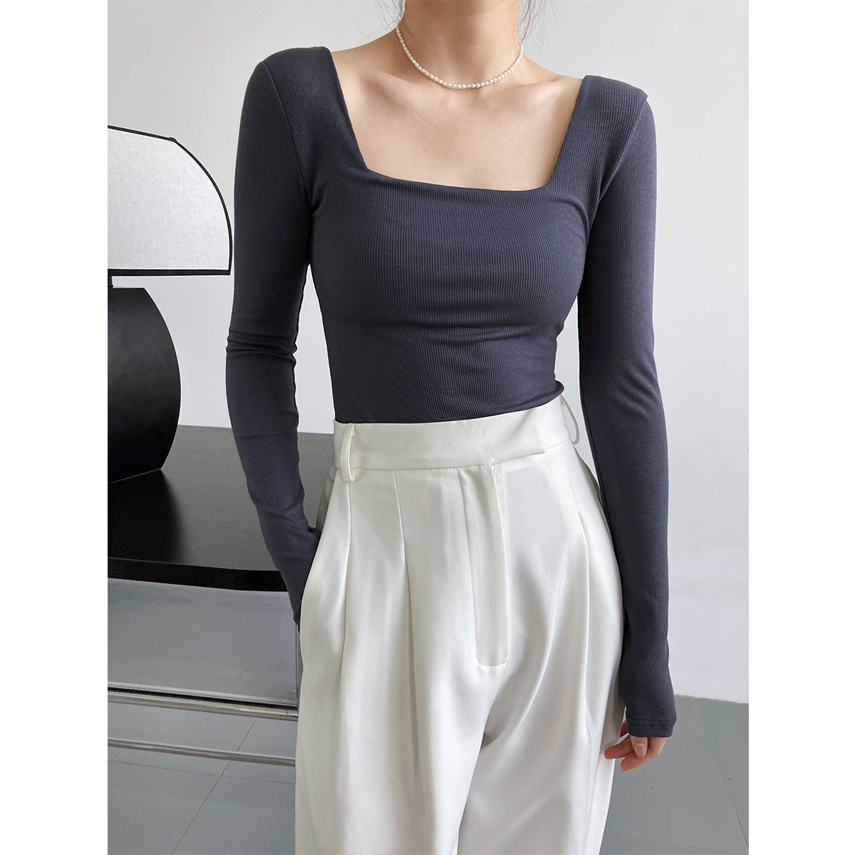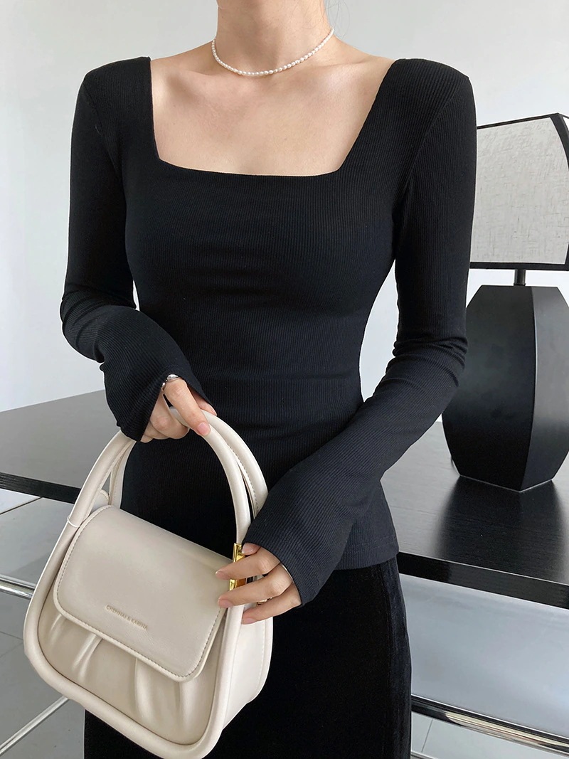 フランス風 長袖 スクエアネック 鎖骨を出す Tシャツ 無地トップス アンダーウェアXFZ9