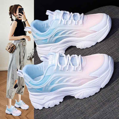 品質保証スニーカー 厚底 白 レディース グラデ かわいい 個性的 ピンク 青 紫 カラフル 韓国風 白スニーカー 紐あり シューズ ローカット グラデーション バイカラー レースアップ きれいめ ダ
