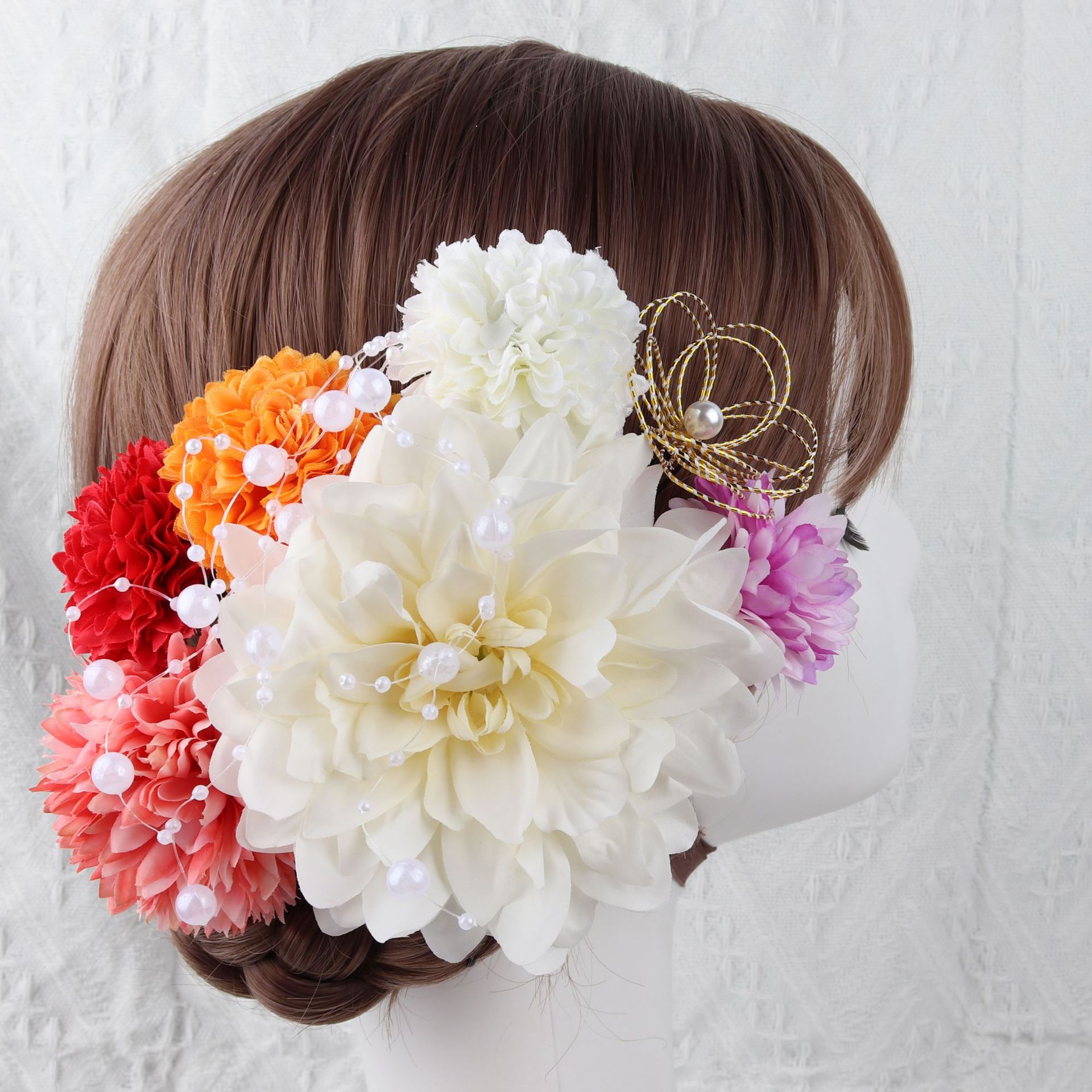 日系水引結びの可愛い髪飾り多色展開 夏用の浴衣に合うロングタイプのビーズ串とフリンジ付きの大輪菊の髪飾りセット和服アクセサリー