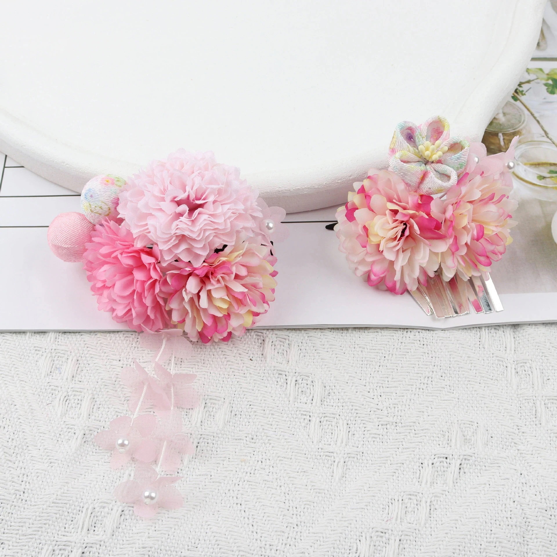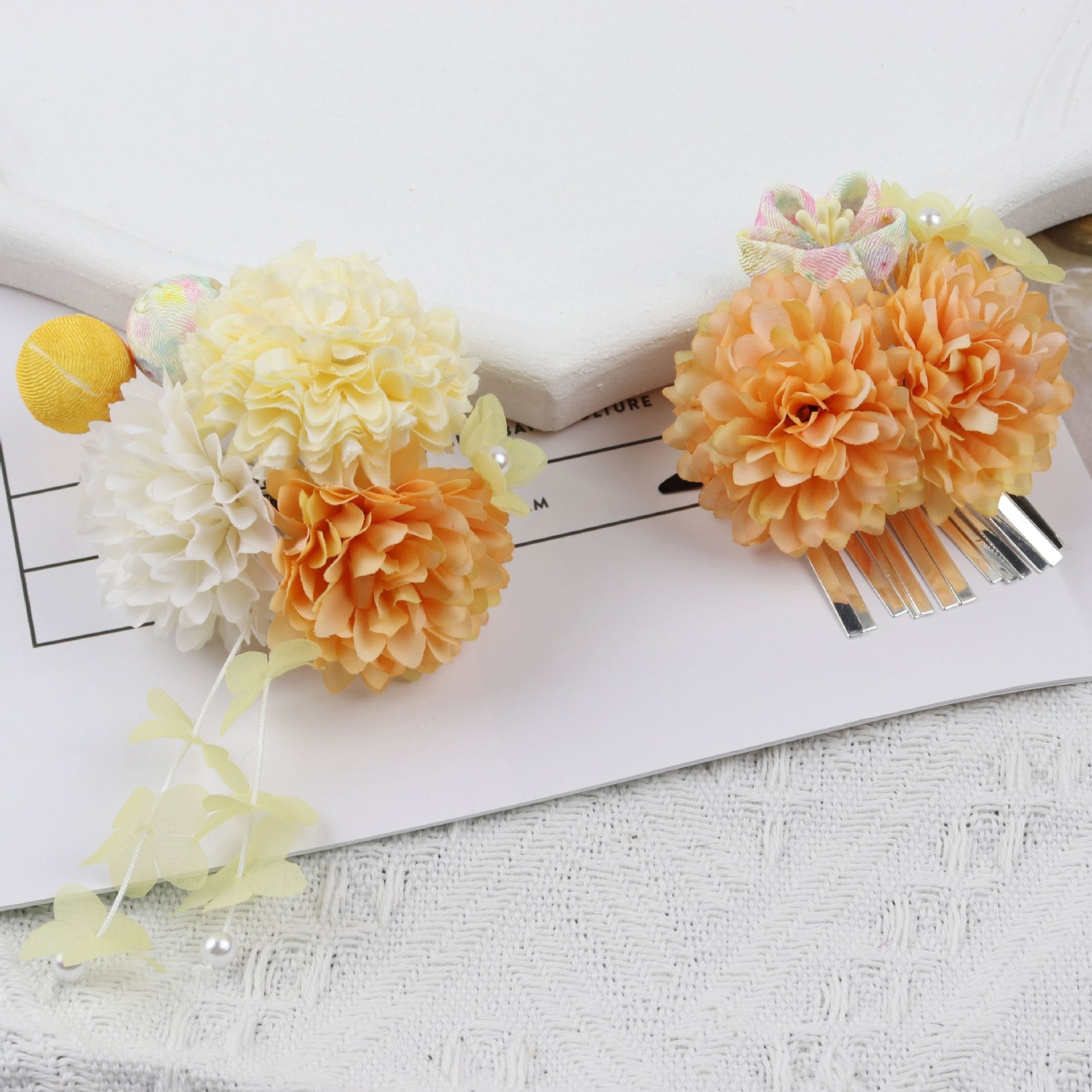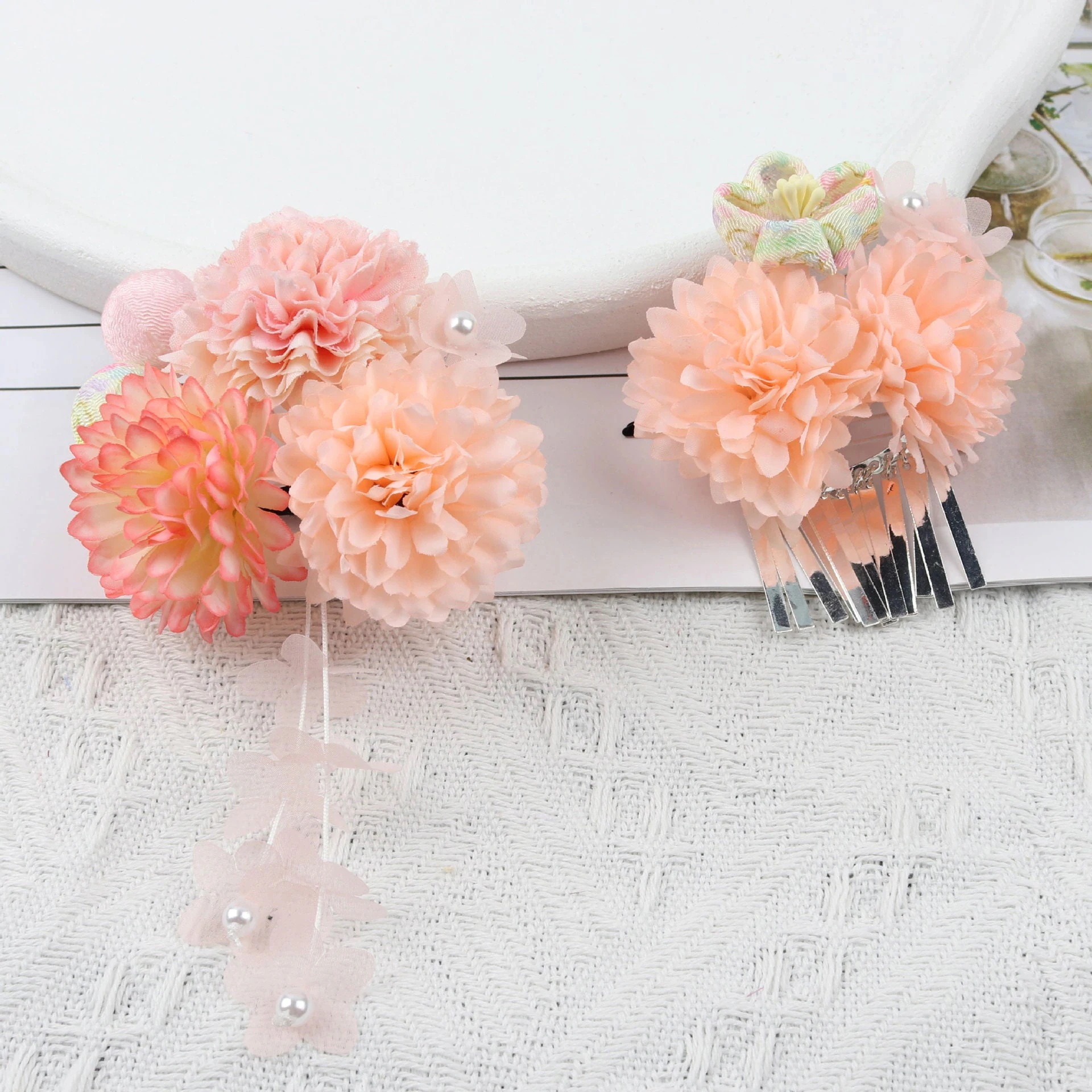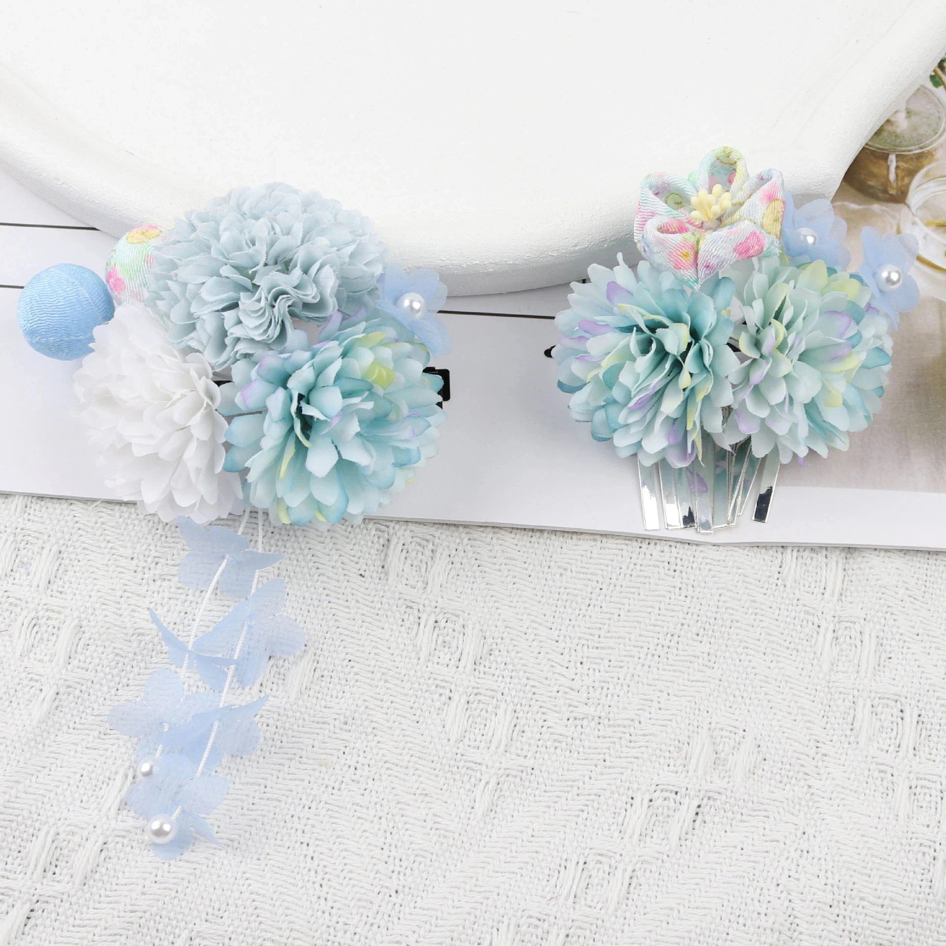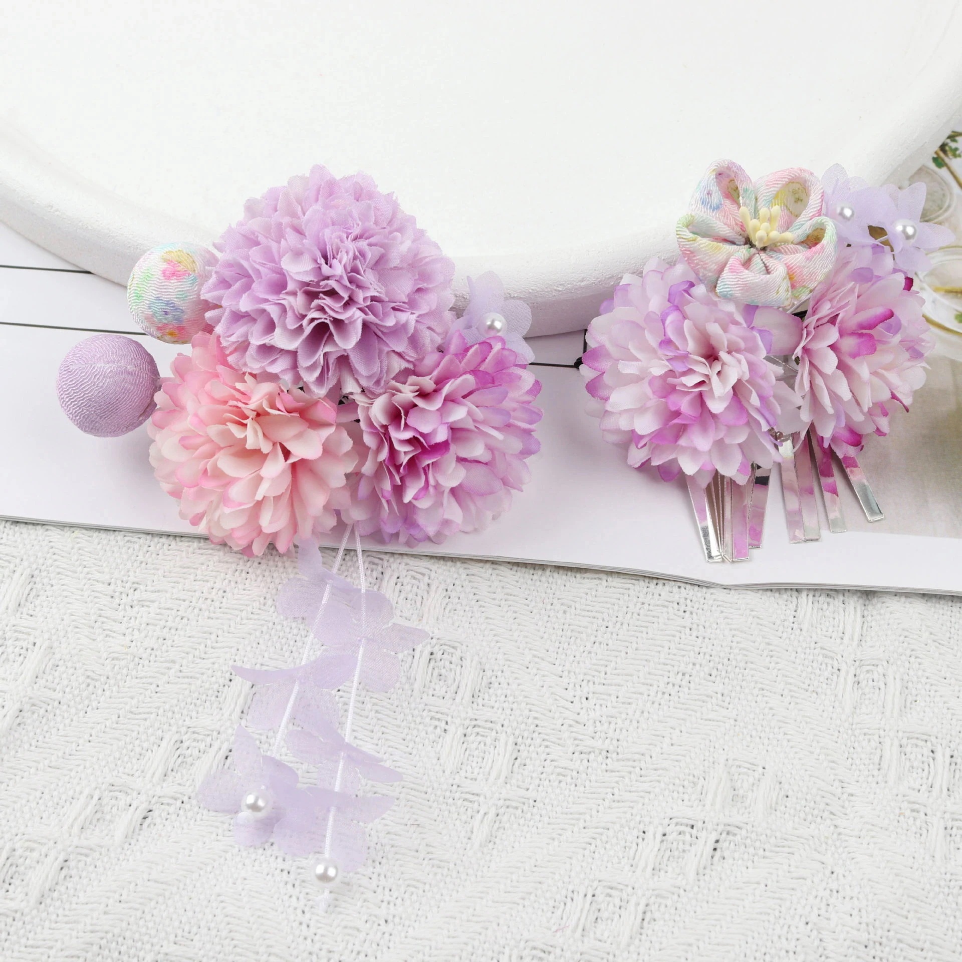 夏用浴衣用千層菊柄の髪留め プリントズボン生地のボールサテン花柄 キャンディカラーの女の子用和風髪飾り2点セット 和服アクセサリー