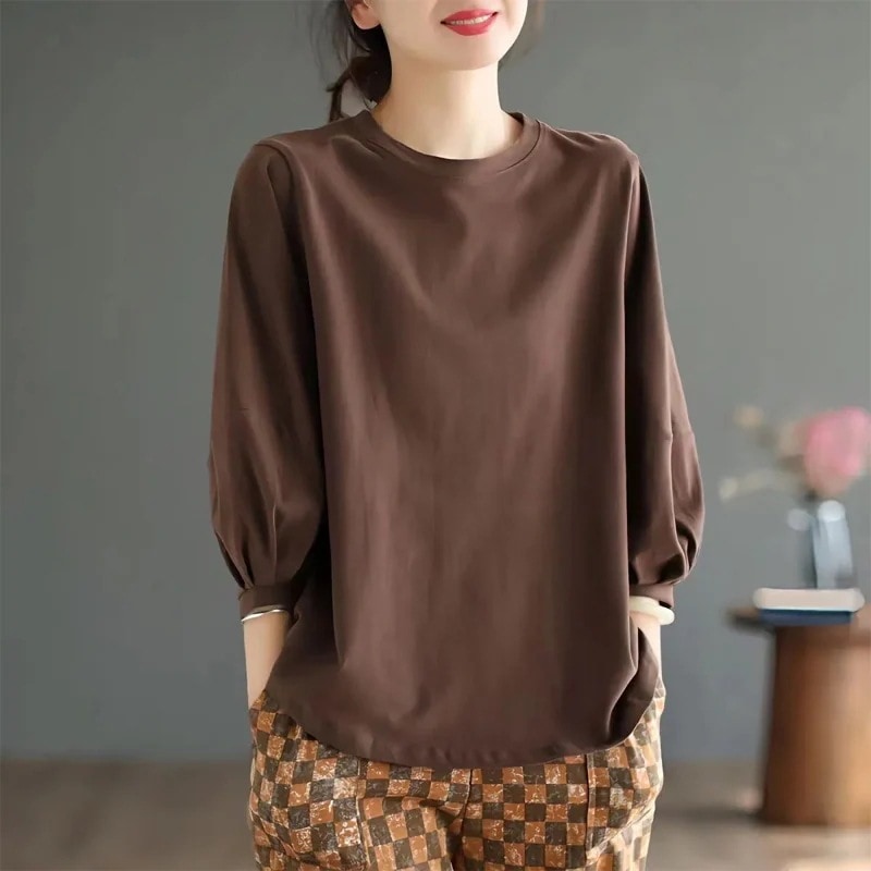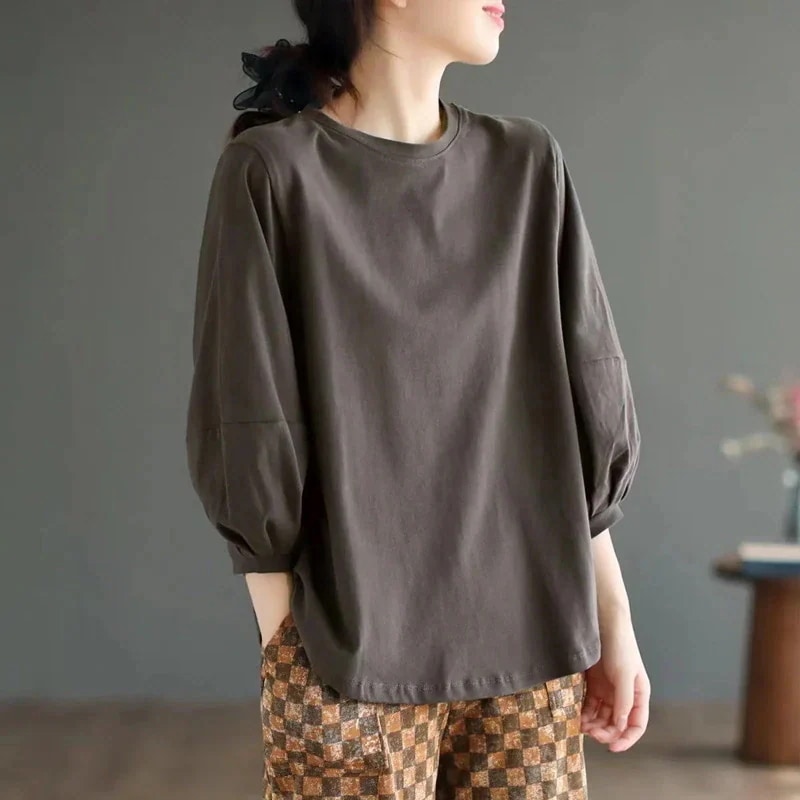 おしゃれで若々しいカジュアルな7分袖トップス 春用Tシャツ 夏の新作 どんなスタイルにも合う 文学的でレトロなデザイン ショートスリーブTシャツ(女性用)