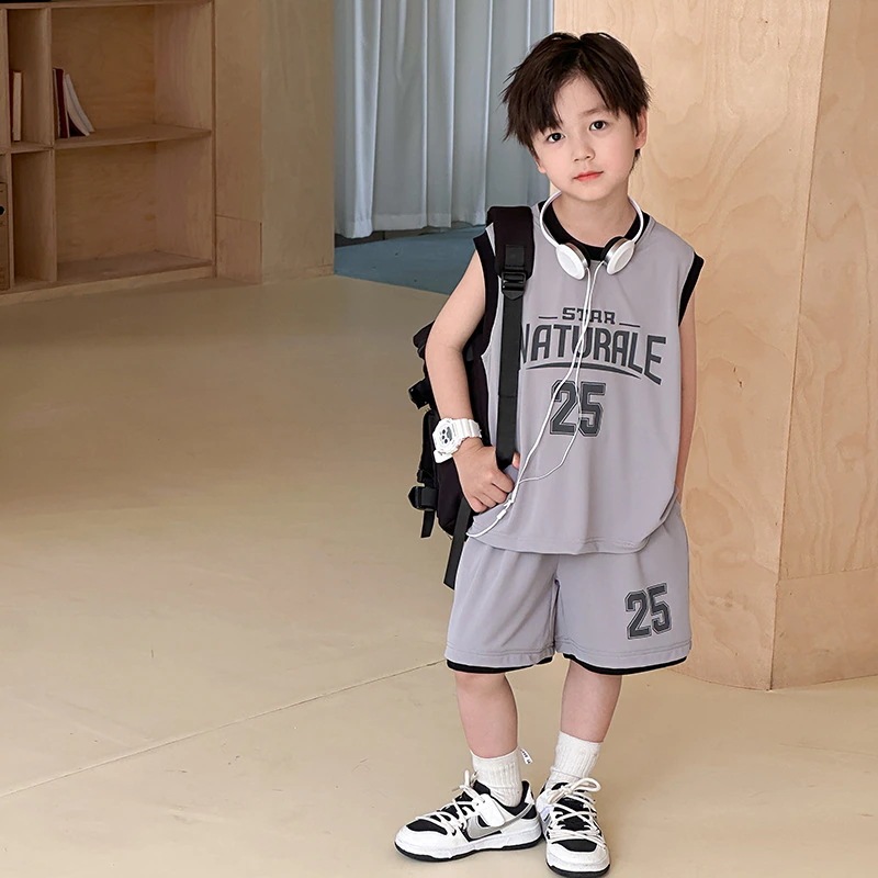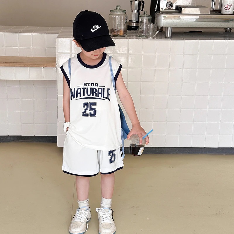 子供服 男の子 2025夏男児衝突色アルファベット運動2点セット赤ちゃん網目通気バスケットボールベストセット 夏 韓国 子供服 セットアップ