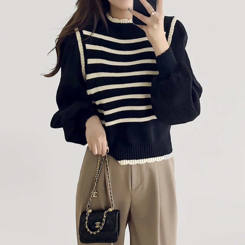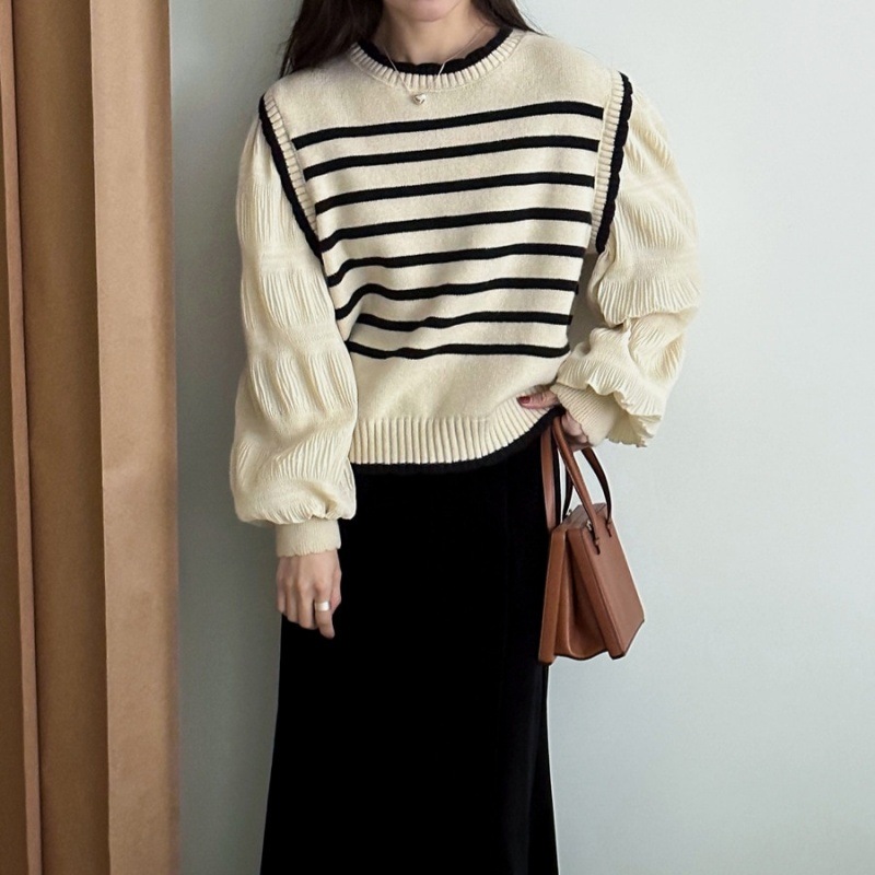 2025新作 ボリュームスリーブ 異素材 ディザイン ニット 洗えるニット セーター レディース 長袖 秋 冬 オフィス 肌触しっとり きれいめ セーター