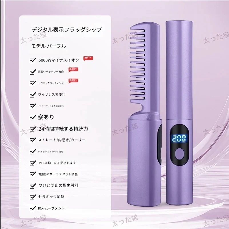 品質いいな ヒートブラシ コードレス ヘアアイロン ブラシアイロン USB充電式 温度3段階調節 デジタル表示 火傷防止 静電気防止 マイナスイオン ポータブル ミニ コンパクト 持ち