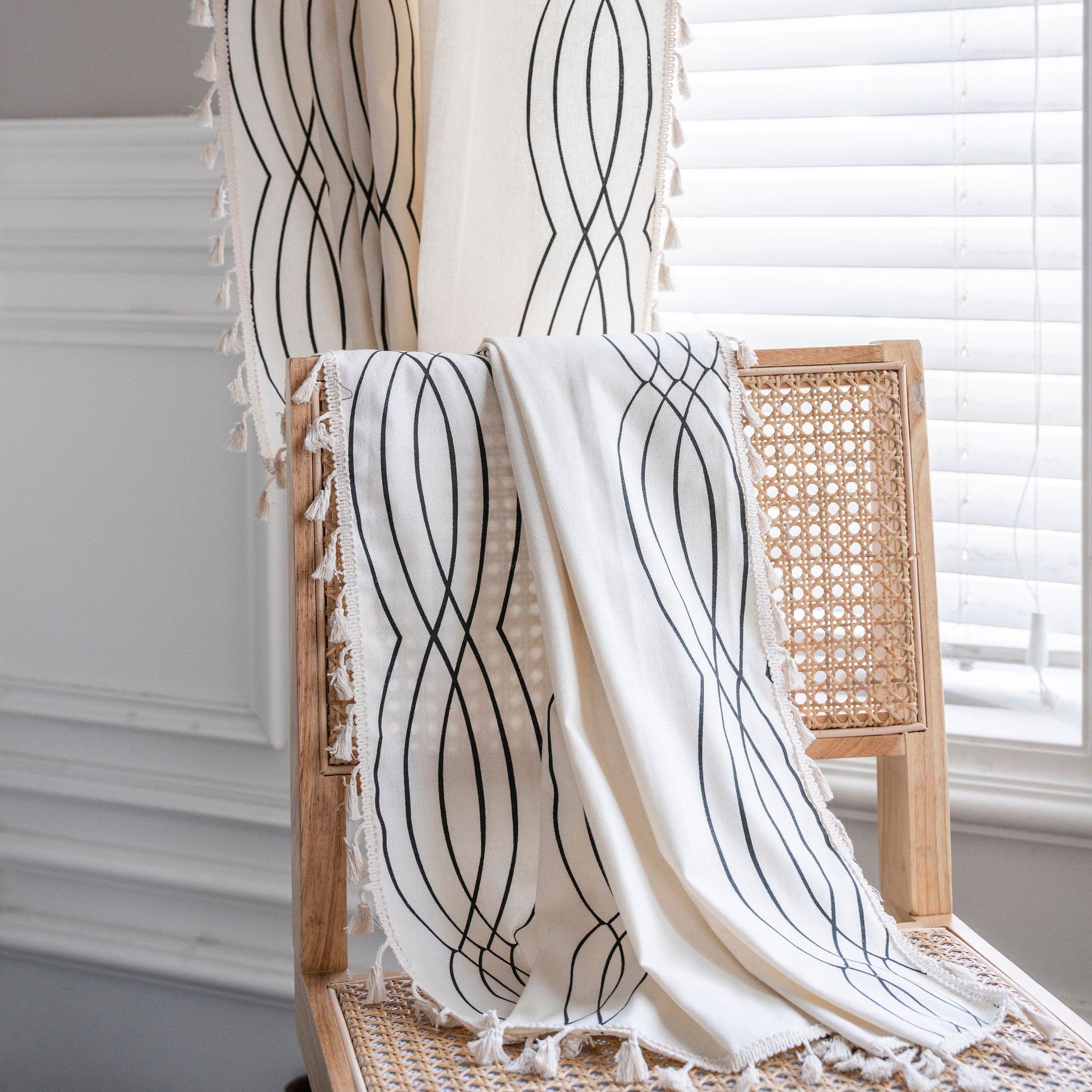 アメリカンボヘミアンベージュタッセル半遮光プリントカーテンリビングベッド出窓完成カーテン