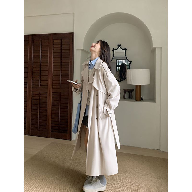 ベージュのゆったりロングカーディガン秋のドレープ感長袖ダブルバックルスリムコート気品コート